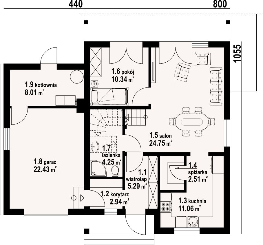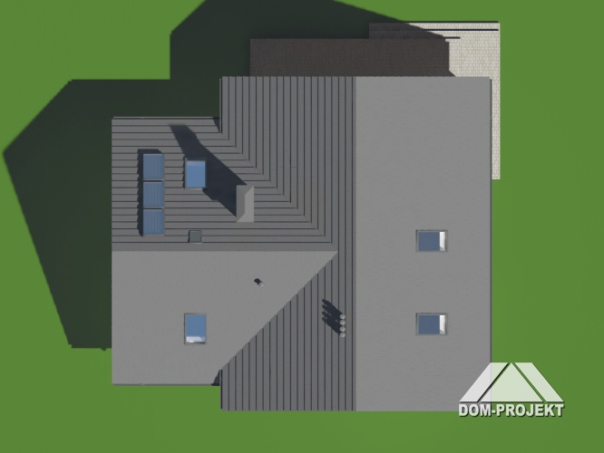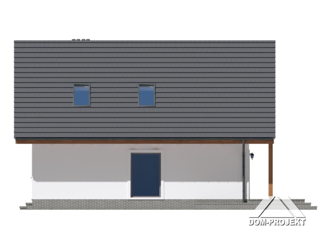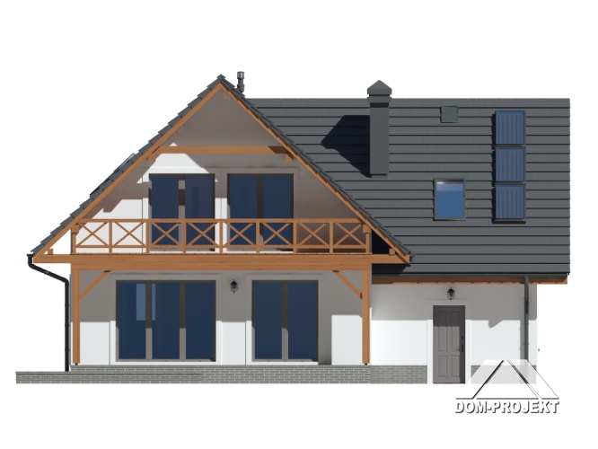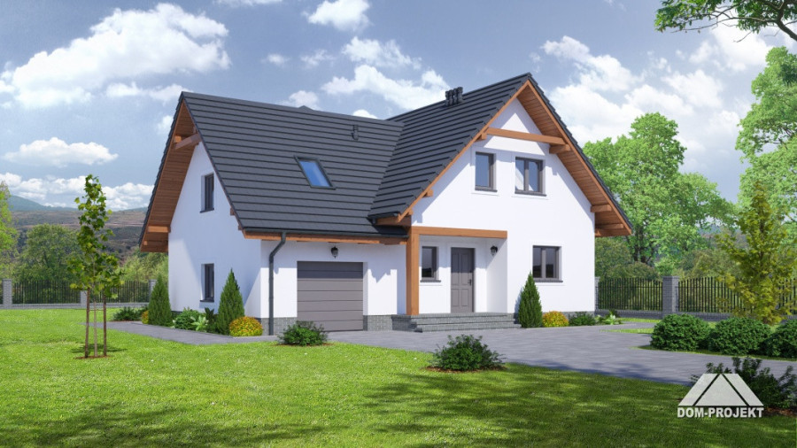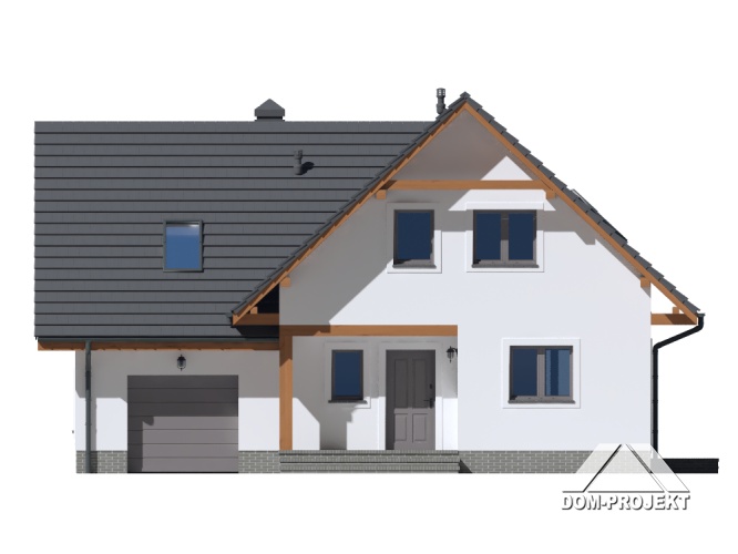 Dom w technologi szkieletowej z tynkiem na zewnątrz. Na parterze duży salon, kuchnia z wydzieloną spiżarką, pokój, schody na poddasze i łazienka. Garaż wraz z kotłownią w bocznej części. Na poddaszu 3 pokoje, łazienka, garderoba. Nad garażem pomieszczenie gospodarcze oraz pralnia.