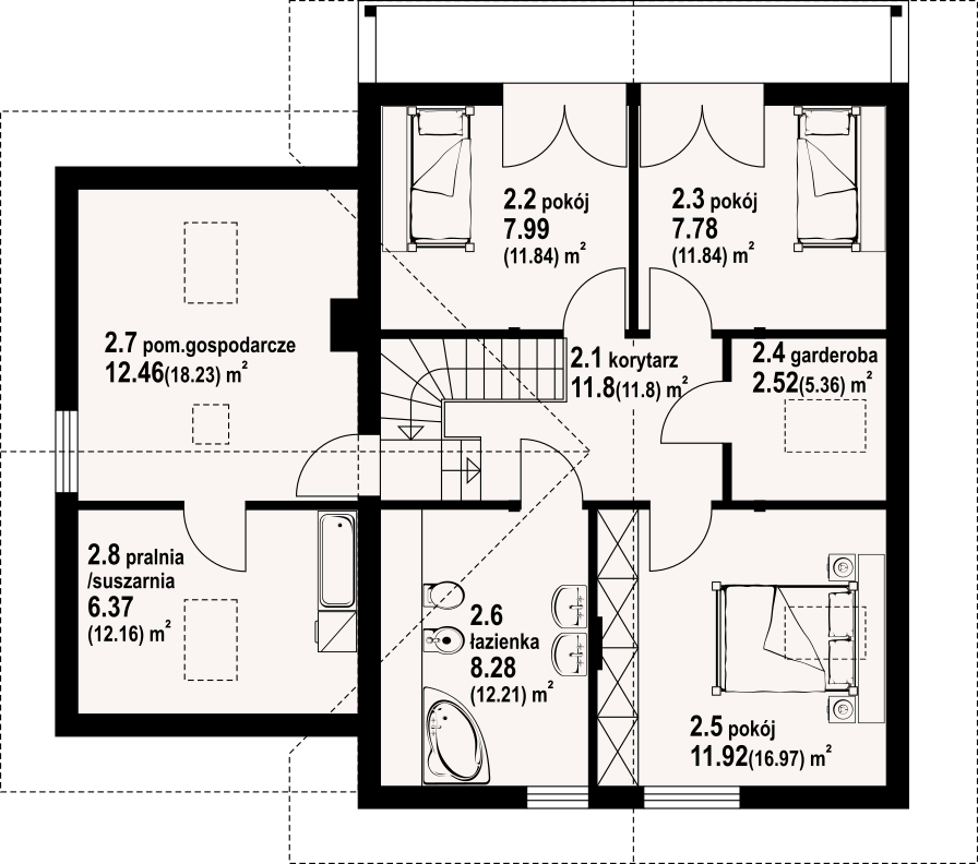 Inwestorzy wybierając projekt domu o średnim metrażu stają przed dylematem, czy postawić na przestronność pomieszczeń, czy też skupić się na zapewnieniu każdemu z domowników własnej przestrzeni. Twórcy Gładyszów 36 dws na powierzchni użytkowej 107,11 m2 wygospodarowali aż pięć pokoi oraz szereg pomieszczeń spełniających dodatkowe funkcje. Dwie łazienki stanowią wystarczające zaplecze sanitarne, przechowywaniu służy garderoba na drugiej kondygnacji oraz spiżarka obok kuchni. W planie znalazł się także garaż z kotłownią zorganizowane w dobudówce – przestrzeń nad nimi wykorzystano tworząc pomieszczenie gospodarcze i pralnię. W ten sposób gotowy projekt Gładyszów 36 dws staje się jednym z najbardziej funkcjonalnych budynków w serii.