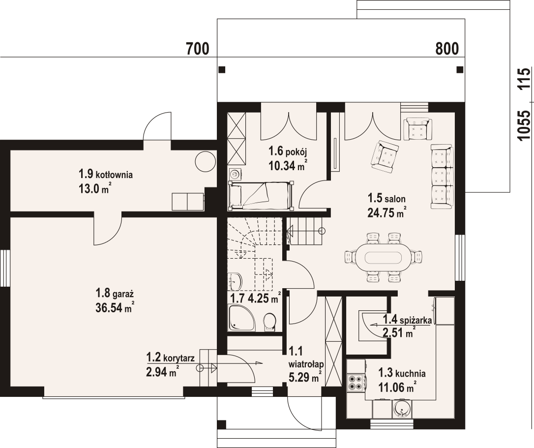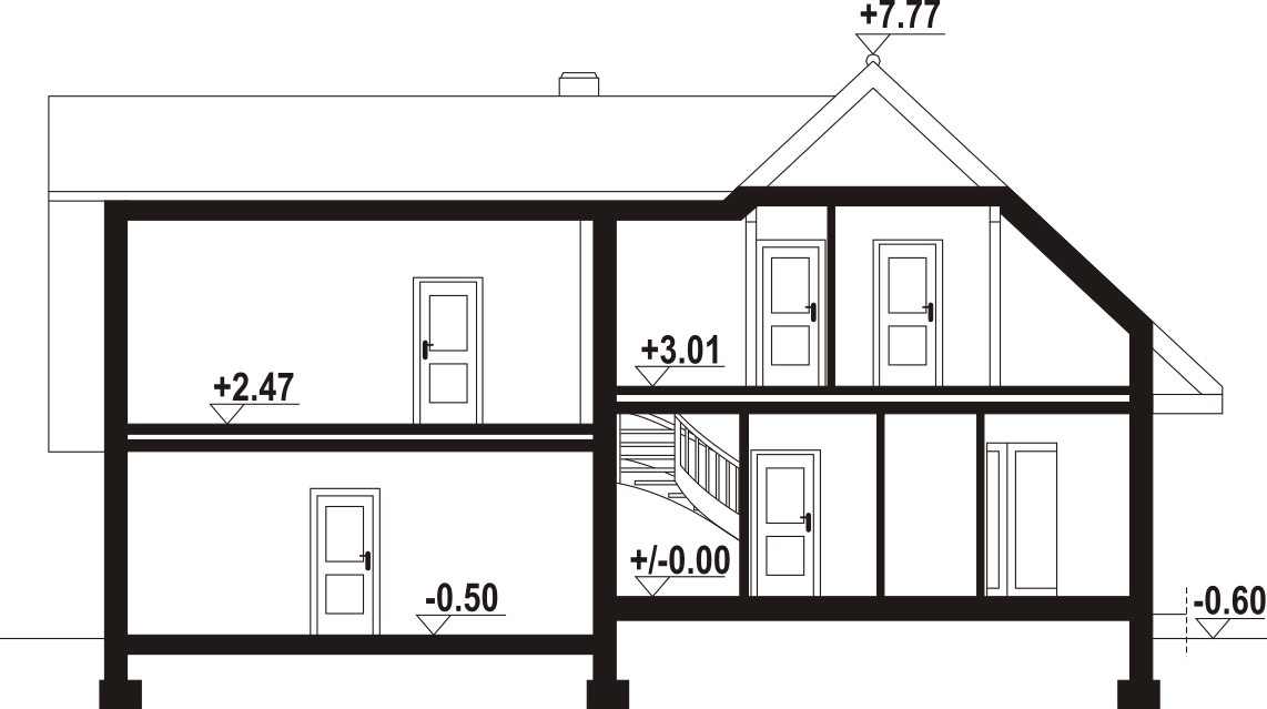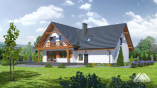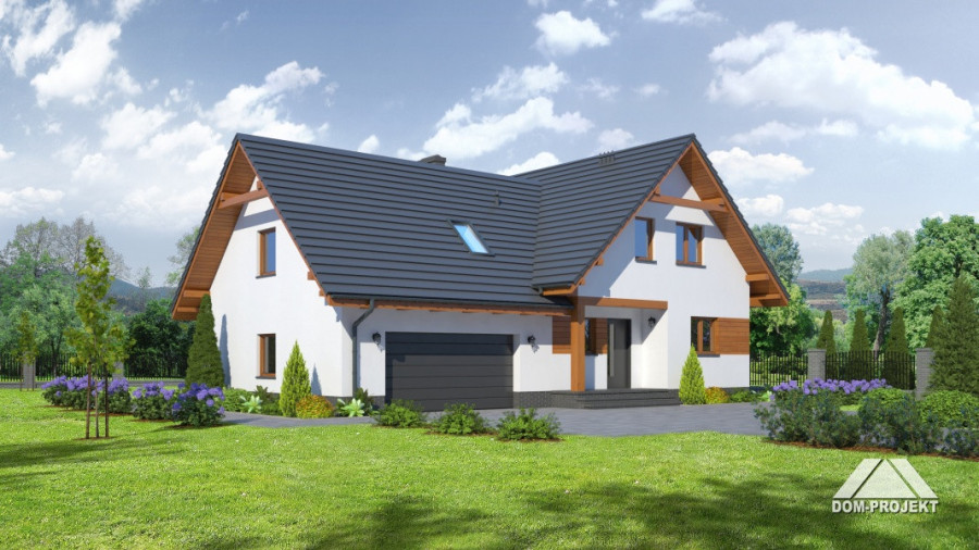 Dom w konstrukcji szkieletu drewnianego. Salon z wyjściem na taras, przejściem do kuchni i schodami na poddasze. Pokój, łazienka, spiżarka, wiatrołap. Garaż na dwa samochody, kotłownia. Na poddaszu trzy pokoje, łazienka, garderoba, korytarz, pralnia i pomieszczenie gospodarcze. Dwa pokoje mają balkon.