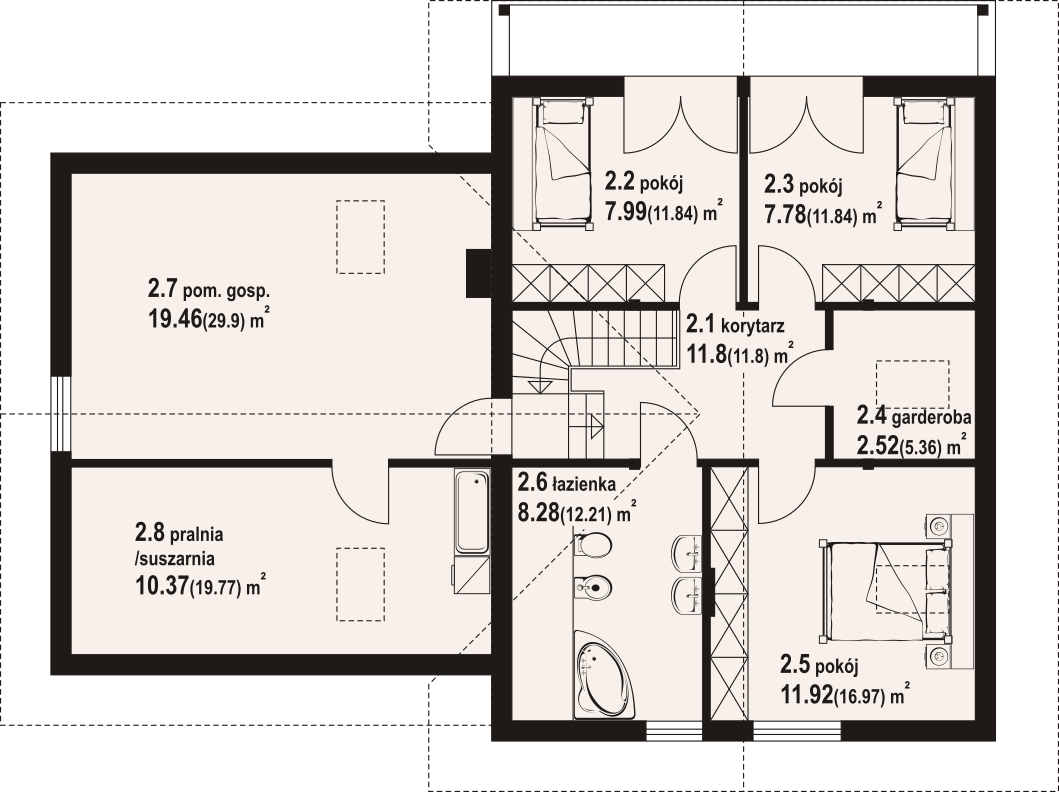 Wkomponowane w projekt jednorodzinnego domu dwustanowiskowego garażu to rozwiązanie, na które coraz częściej decydują się architekci. Nic dziwnego, że wśród propozycji z serii Gładyszów znalazła się również taki wariant, oznaczony jako Gładyszów 36 gg dws. Aby połączyć przestrzeń mieszkalną z powiększoną częścią gospodarczą trzeba wykorzystać 139,71 m2 powierzchni zabudowy. W zamian inwestorzy otrzymują dom o użytkowym metrażu nieznacznie przekraczającym 100 m2. Wystarczy to do aranżacji pięciu pokoi. Dwa z nich zaplanowano na parterze – obok siebie znajdują się salon i sypialnia. To rozwiązanie będzie szczególnie korzystne dla małżonków, który oczekują większej prywatności i chcą oddać poddasze z trzema pokojami do dyspozycji młodszych członków rodziny.