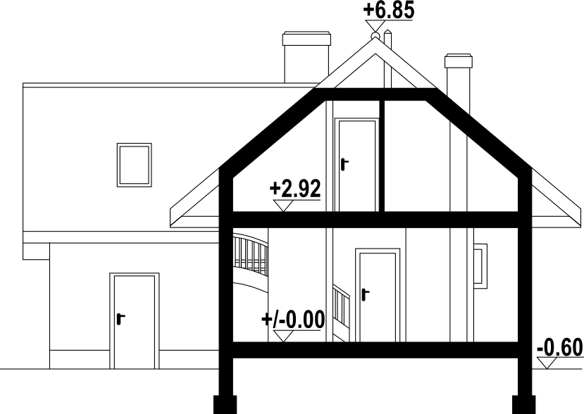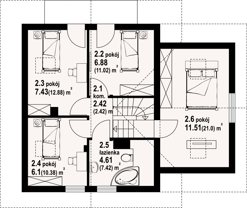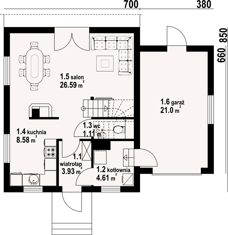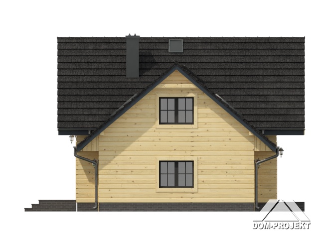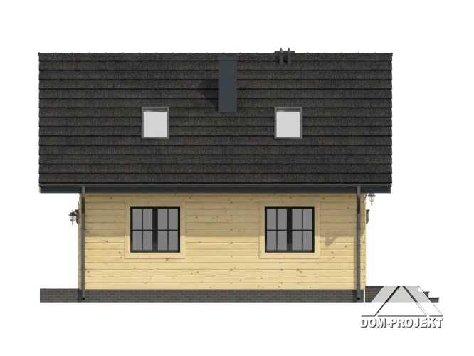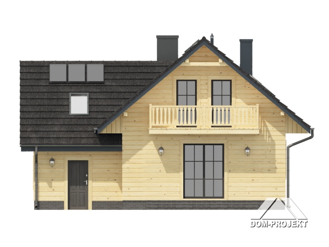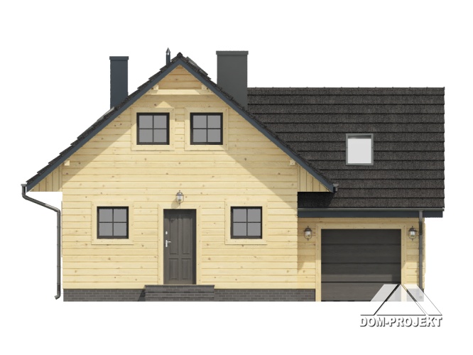 Mały dom z poddaszem mieszkalnym i dobudowanym garażem. Na parterze salon z kominkiem, kuchnia i wydzielona kotłownia. Schody z salonu prowadzą na poddasze, na którym zaprojektowano cztery pokoje i łazienkę. Dwa pokoje posiadają wyjście na balkon. Niski koszt realizacji i użytkowania.