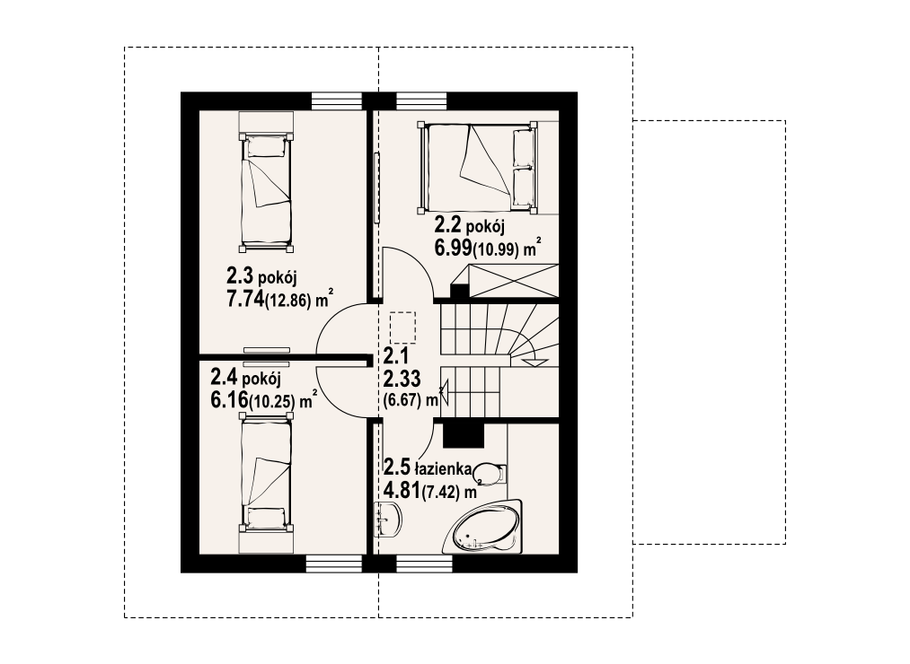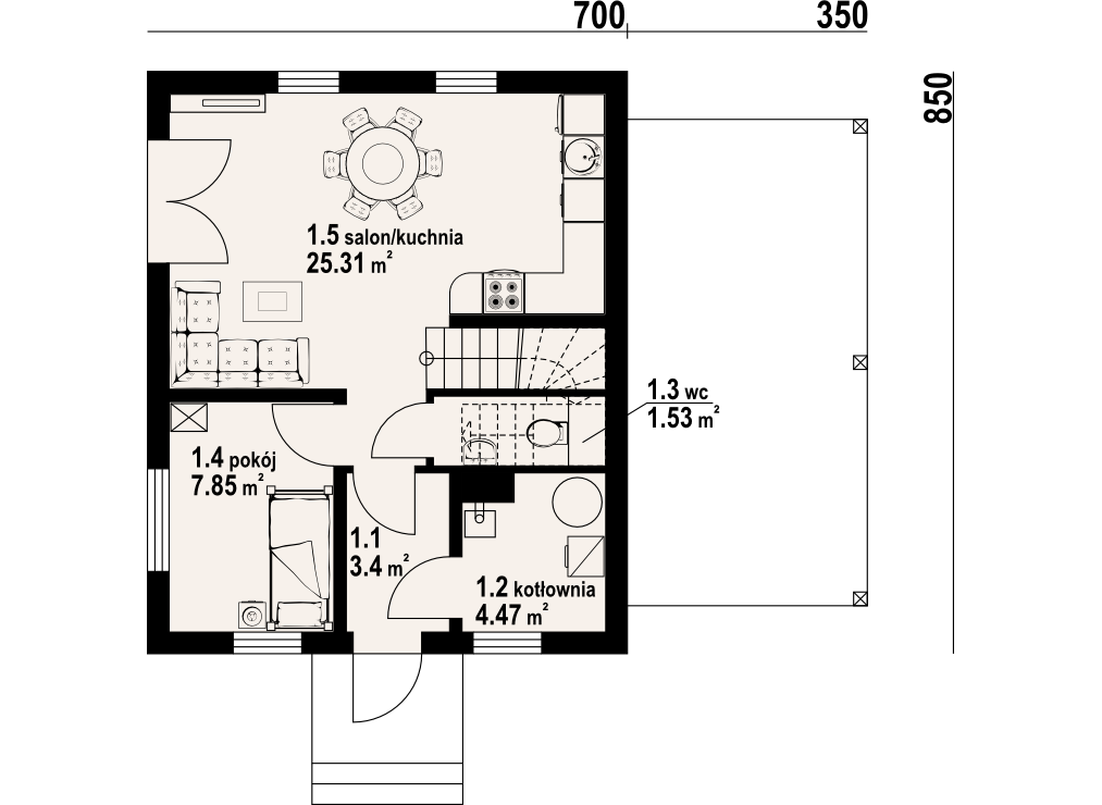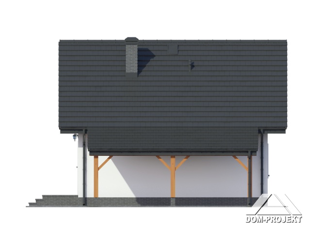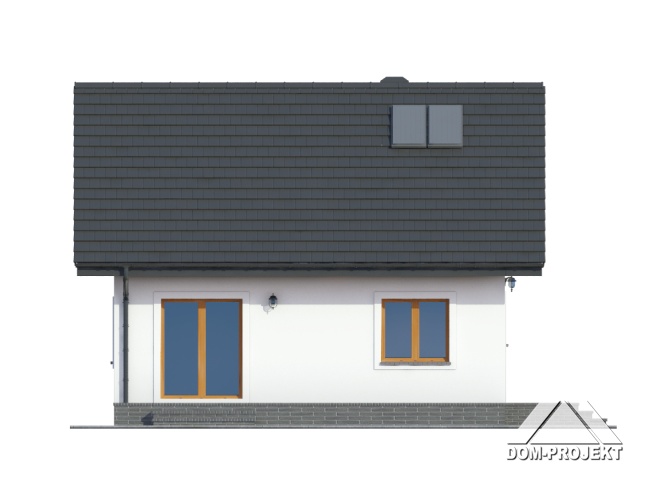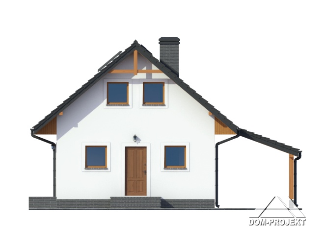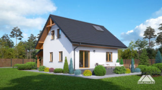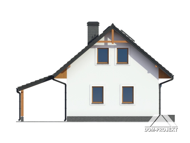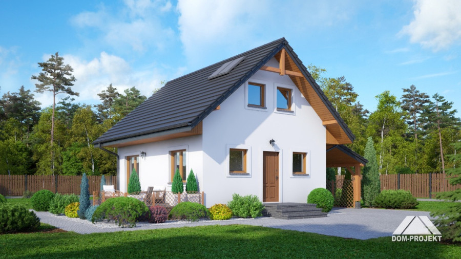 Mały dom z poddaszem użytkowym, ekonomiczny w budowie oraz późniejszym użytkowaniu. Parter to strefa dzienna, a w niej słoneczny salon z aneksem kuchennym, ponadto dodatkowy pokój i kotłownia. Poddasze to strefa nocna z trzema sypialniami i łazienką. Do domu dobudowana jest wiata na samochód.