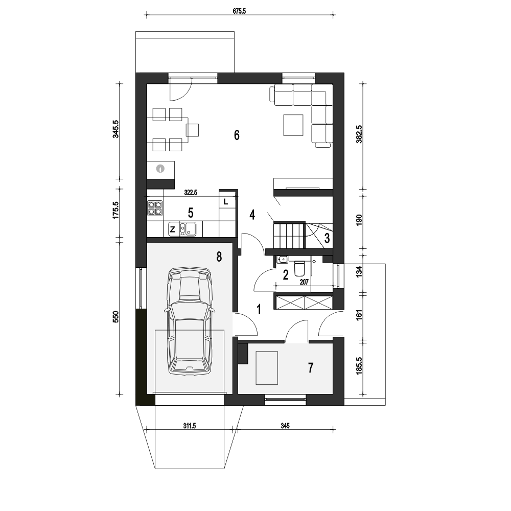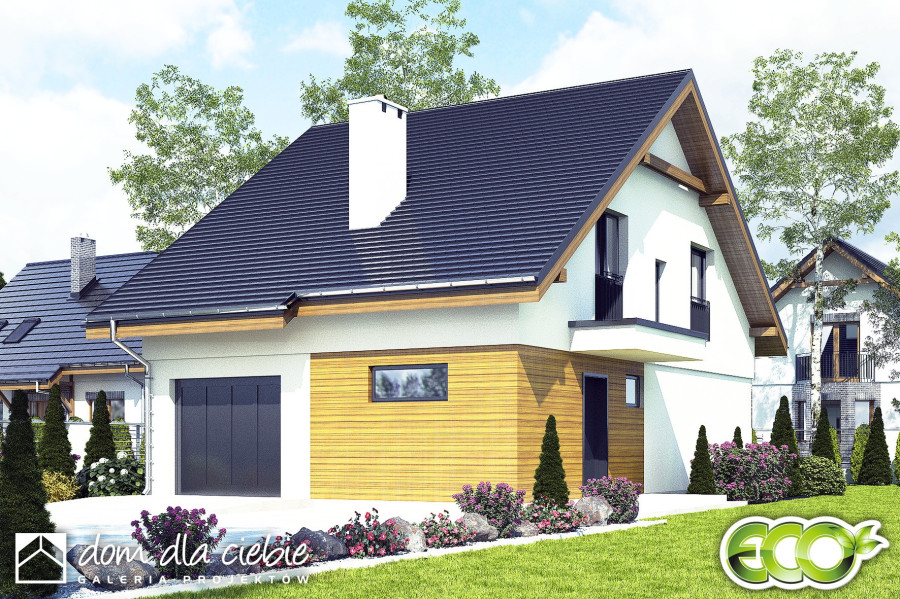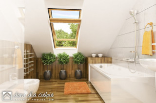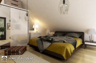 Projekt domu Głuszec jest przykładem klasycznego domu jednorodzinnego z poddaszem przeznaczonym na cele mieszkalne. Ten dwukondygnacyjny i prosty konstrukcyjnie dom jest dobrą alternatywą na wąskie działki lub do zabudowy bliźniaczej. Do budynku prowadzi zadaszone wejście usytuowane z boku budynku. Na parterze zaproponowano strefę wspólną dzienną - salon z otwartą kuchnią. Z salonu można wyjść na taras a pomiędzy kuchnią a strefą jadalni zaprojektowano kominek. Przy wejściu znajdziemy miejsce na wygodną szafę wnękową natomiast pod schodami wygospodarowano miejsce na przydatną spiżarnię. Wiatrołap prowadzi również do małej łazienki oraz do garażu i kotłowni z piecem na paliwo stałe. Kotłownię zaprojektowano od frontu budynku. Na piętrze zaproponowano trzy sypialnie, garderobę oraz duża łazienkę. Głuszec II to dom ekonomiczny w budowie i eksploatacji. Ze względów ekonomicznych zrezygnowano z balkonów i tarasów. Zastosowane portfenetry i dodatkowo okna połaciowe sprawią, że każde pomieszczenie na poddaszu będzie doskonale doświetlone. Elewację domu charakteryzuje delikatny detal i naturalna kolorystyka.fundamenty: BETONOWE ściany zewnętrzne: POROTHERM+STYROPIAN TERMO ORGANIKA rodzaj stropu: TERIVA I elewacje: TYNK STRUKTURALNY pokrycie dachu: DACHÓWKA CEM. lub CER.