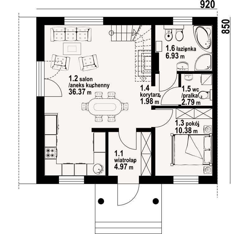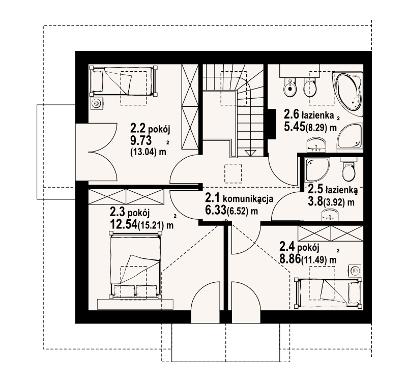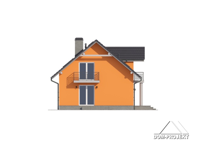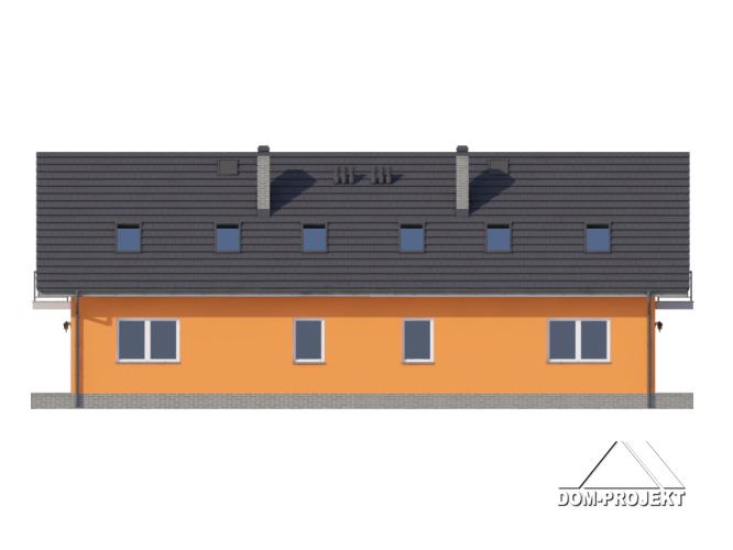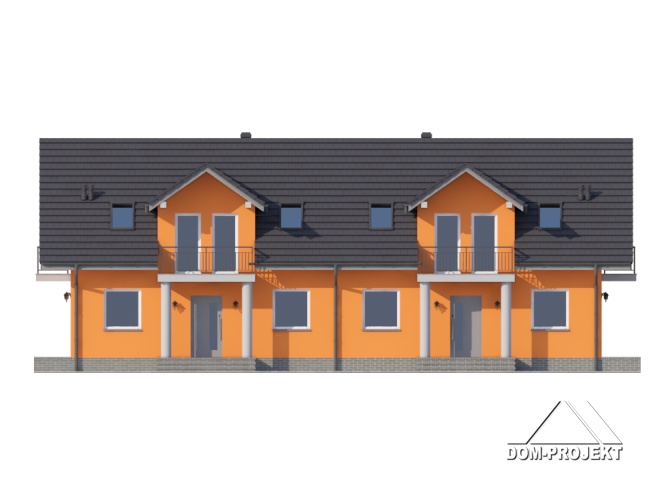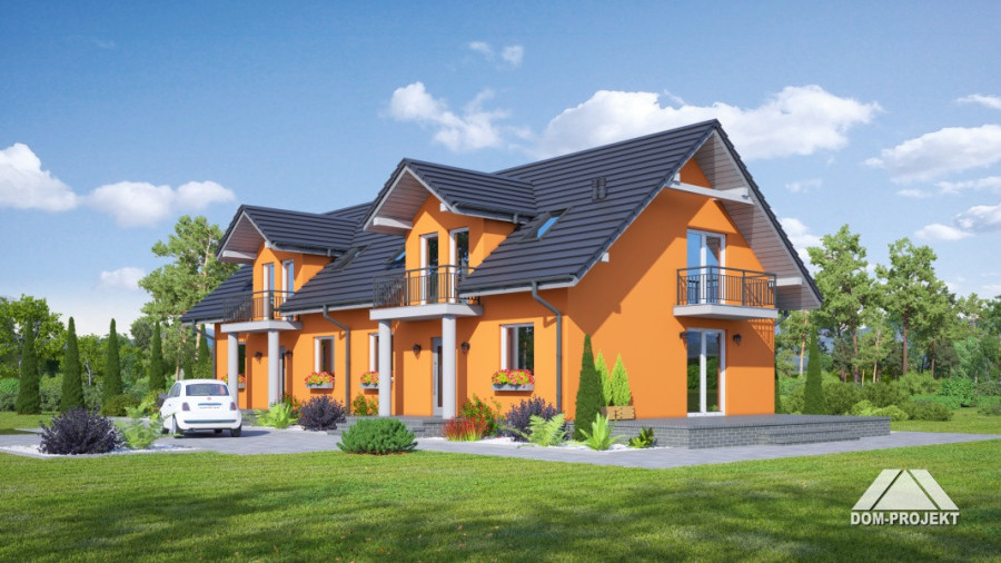 Dom jednorodzinny z dwoma lokalami mieszkalnymi. Każdy lokal: duży salon z aneksem kuchennym, kominkiem, wyjściem na taras. Pokój, łazienka, wc, korytarz, wiatrołap. Na poddaszu trzy pokoje, dwie łazienki, dwa balkony i komunikacja. Prosta bryła budynku i dach dwuspadowy sprzyjają szybkiej i taniej budowie i niskim kosztom eksploatacji.