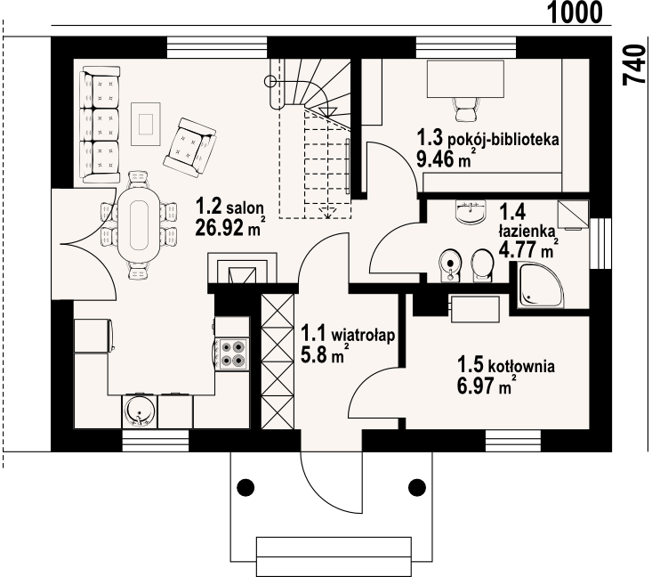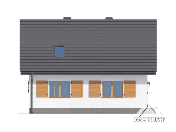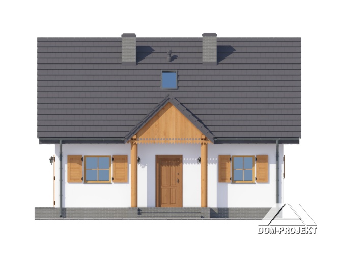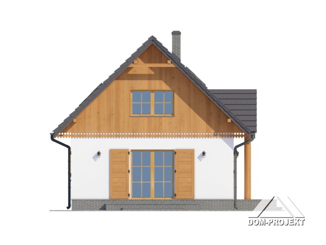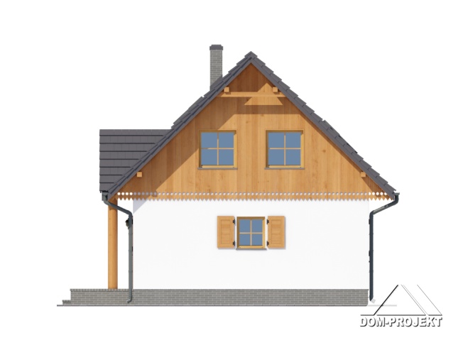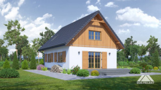 Dom z poddaszem użytkowym. Salon z aneksem kuchennym, kominkiem, wyjściem na taras i schodami na poddasze. Pokój, łazienka, kotłownia i wiatrołap z miejscem na szafy. Na poddaszu trzy pokoje, łazienka, garderoba i komunikacja. Zwarta bryła budynku i dach dwuspadowy sprzyjają szybkiej i taniej budowie i niskim kosztom eksploatacji.