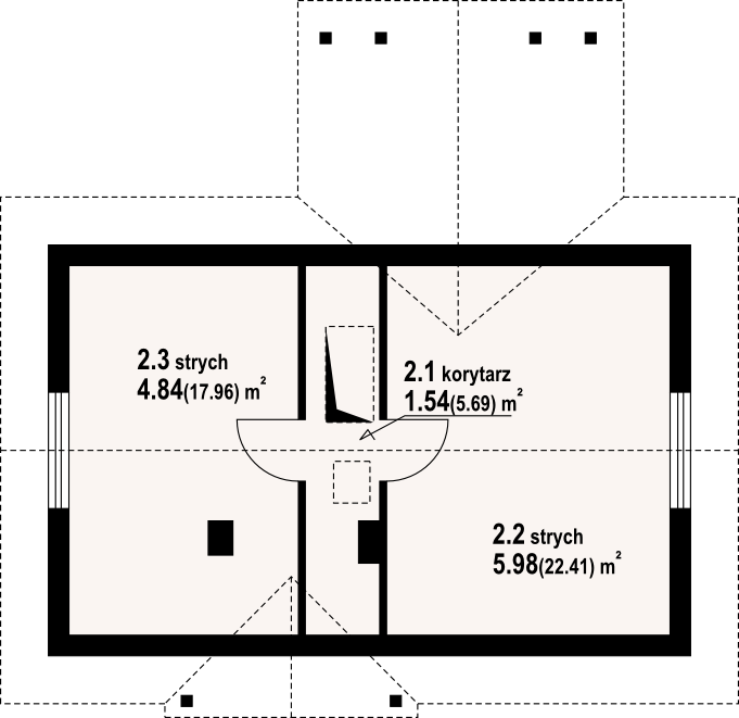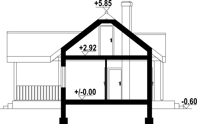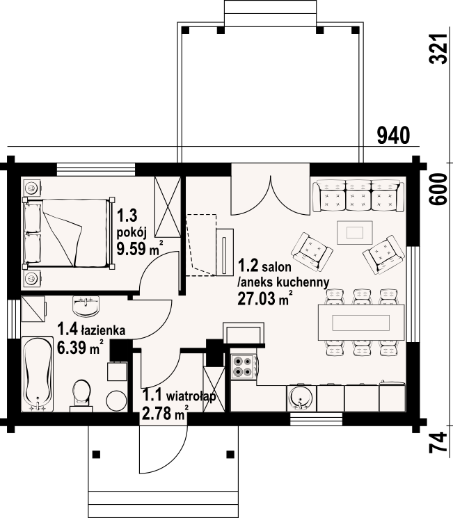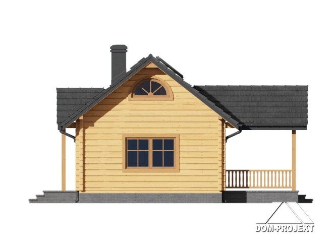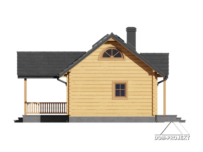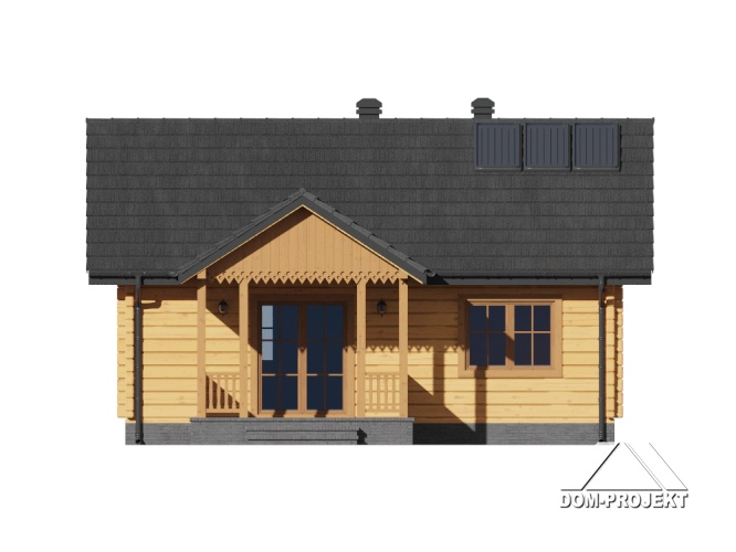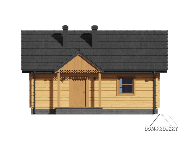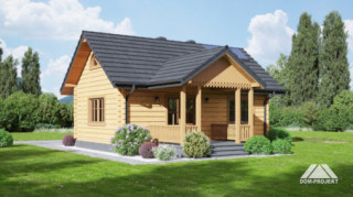Mały dom parterowy –konstrukcja drewniana z bali. Dom mieszkalny lub letniskowy. Dwa pokoje, aneks kuchenny, łazienka, wiatrołap, duży zadaszony taras. W salonie kominek i schody składane na poddasze (możliwość wykorzystania poddasza na cele gospodarcze lub dodatkowe spanie w lecie). Dom łatwy i tani w budowie i tani w eksploatacji.