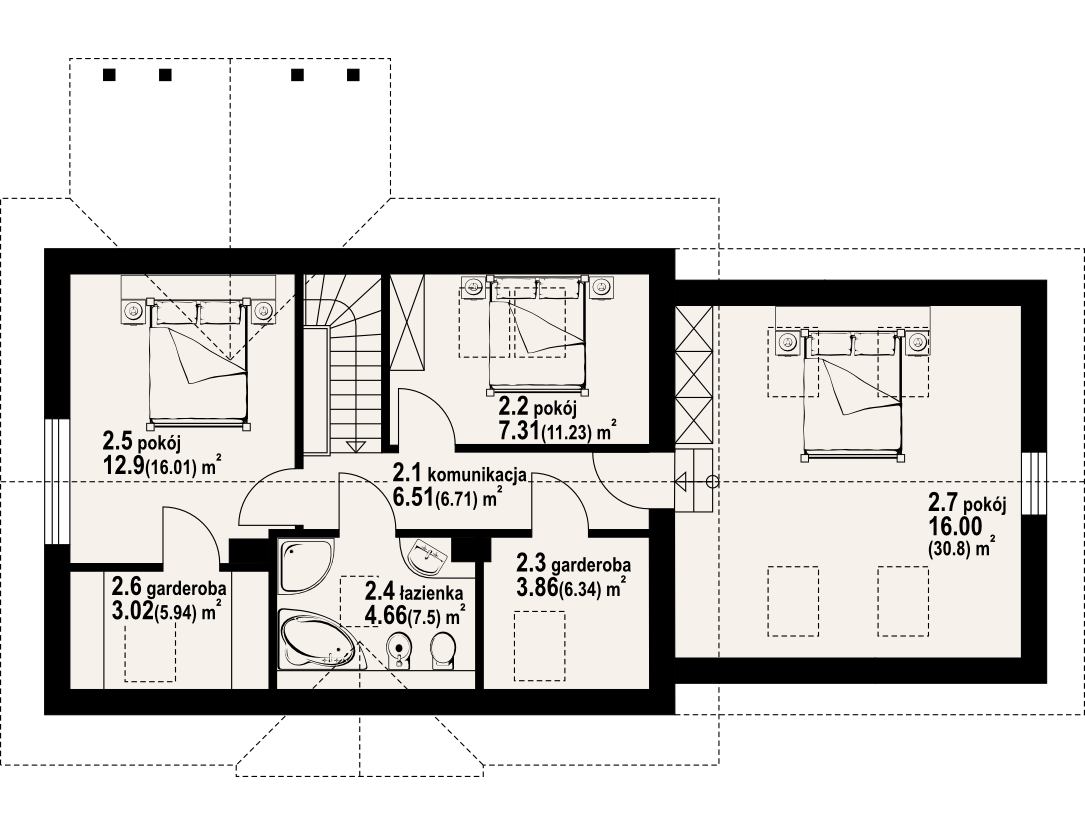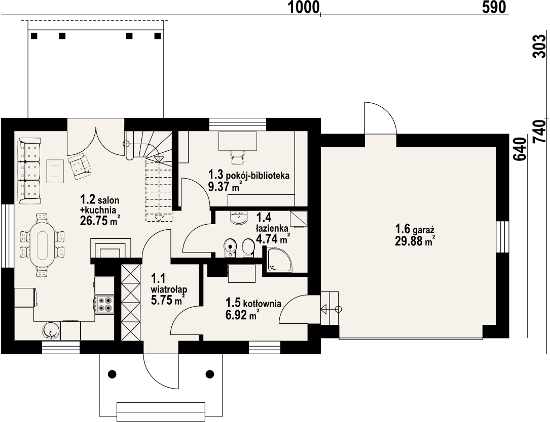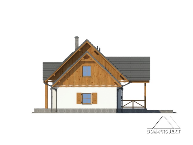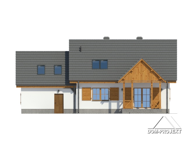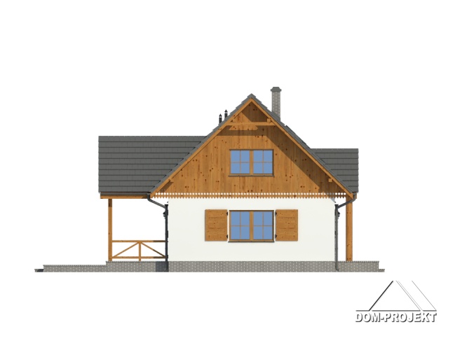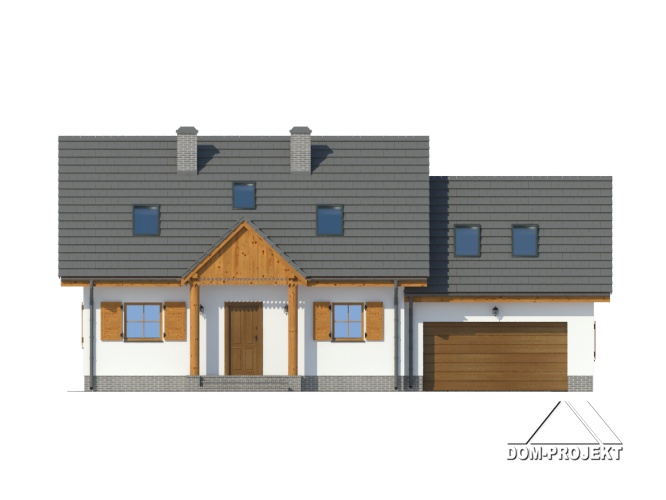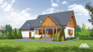 Wygodny dom z poddaszem i garażem. Duży salon z aneksem kuchennym, kominkiem, wyjściem na zadaszony taras i schodami na poddasze. Pokój, łazienka, kotłownia, wiatrołap i garaż. Na poddaszu trzy pokoje, łazienka, dwie garderoby i komunikacja. Zwarta bryła budynku i dach dwuspadowy sprzyjają taniej i szybkiej budowie i niskim kosztom eksploatacji.
