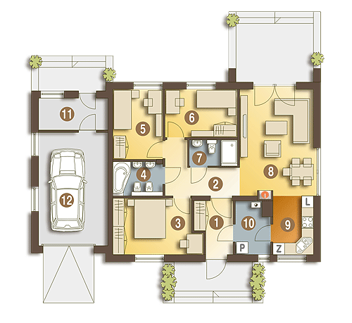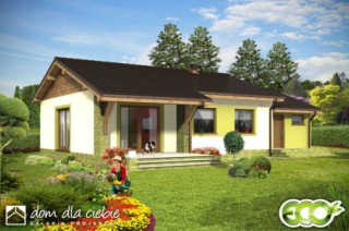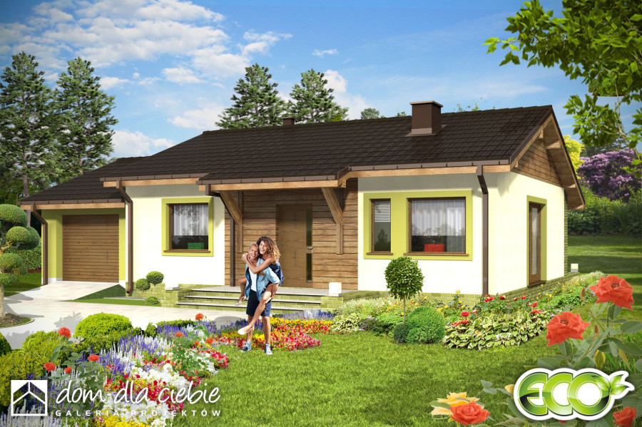 Prosty i zgrabny dom parterowy dla 4-osobowej rodziny. Budynek na niewielkiej powierzchni mieści wszystkie potrzebne pomieszczenia: 3 sypialnie, pokój dzienny z wyjściem na zadaszony taras, ustronnie położoną kuchnię, niemałe pom. techniczne z piecem i pralką, dwie łazienki, oraz w wersji z garażem z boku dodatkowe pom. gospodarcze z wejściem od ogrodu, które można adaptować na kotłownię na paliwo stałe. Dom ten dzięki niewielkim gabarytom, prostej bryle, dwuspadowym dachu oraz nieskomplikowanym rozwiązaniom konstrukcyjnym daje możliwość niedrogiej realizacji.fundamenty: BETONOWE ściany zewnętrzne: PUSTAK CERAM. POROTHERM+STYROPIAN TERMO ORGANIKA ściany wewnętrzne: PUSTAK POROTHERM rodzaj stropu: TERIVA elewacje: TYNK STRUKTURALNY/OKŁ. KAMIENNA/KLINKIEROWA pokrycie dachu: DACHÓWKA CEM. lub CER.