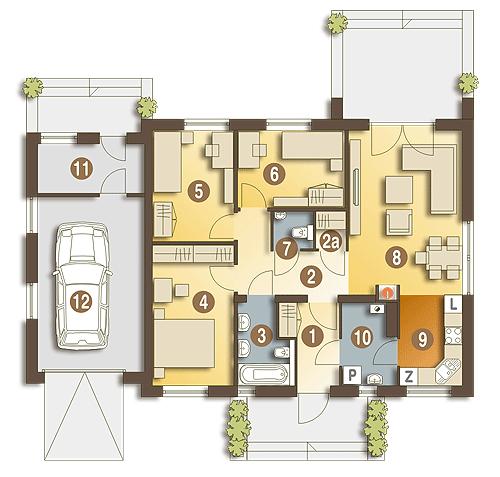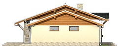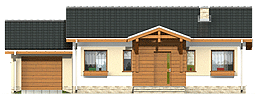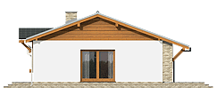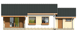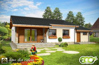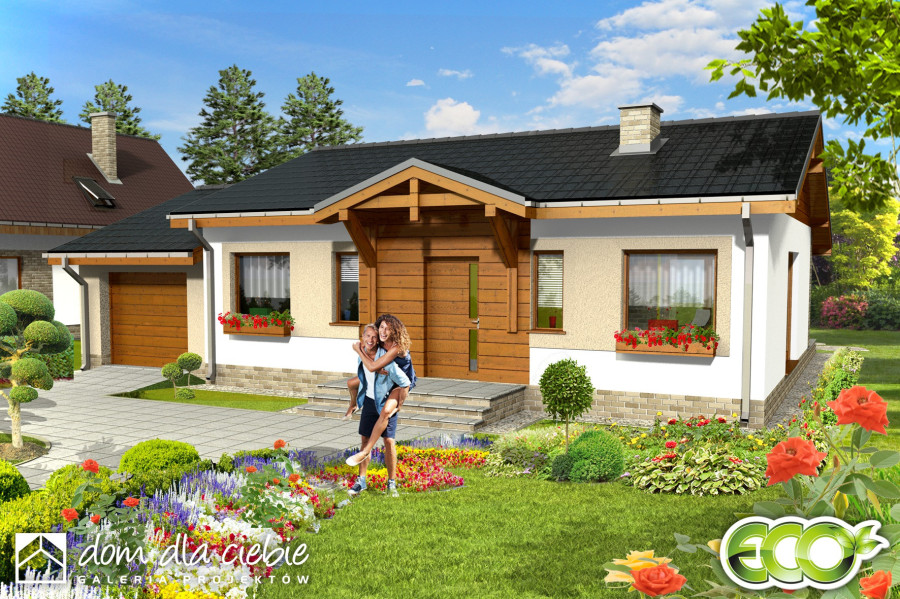 Prosty i zgrabny dom parterowy dla 4-osobowej rodziny. Budynek na niewielkiej powierzchni mieści wszystkie potrzebne pomieszczenia: 3 sypialnie, pokój dzienny z wyjściem na zadaszony taras, ustronnie położoną kuchnię, niemałe pom. techniczne z piecem i pralką, dwie łazienki, oraz w wersji z garażem z boku dodatkowe pom. gospodarcze z wejściem od ogrodu, które można adaptować na kotłownię na paliwo stałe. Dom ten dzięki niewielkim gabarytom, prostej bryle, dwuspadowym dachu oraz nieskomplikowanym rozwiązaniom konstrukcyjnym daje możliwość niedrogiej realizacji. Projekt powstał na bazie domu Hugo, zawiera drobne modyfikacje wyglądu, zmianę lokalizacji łazienki oraz jeszcze większą cześć garażową.fundamenty: BETONOWE ściany zewnętrzne: PUSTAK CERAM. POROTHERM+STYROPIAN TERMO ORGANIKA ściany wewnętrzne: PUSTAK POROTHERM rodzaj stropu: TERIVA elewacje: TYNK STRUKTURALNY/OKŁ. DREWNIANA/KLINKIEROWA pokrycie dachu: DACHÓWKA CEM. lub CER.
