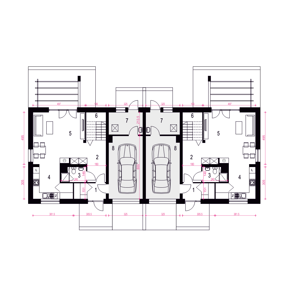 (Uwaga: projekty typu bliźniak oferujemy jako domy dwulokalowe, projekt można zamówić również w zabudowie bliźniaczej)fundamenty: BETONOWE ściany zewnętrzne: BLOCZKI SILIKATOWE+STYROPIAN TERMO ORGANIKA rodzaj stropu: MONOLITYCZNY elewacje: TYNK STRUKTURALNY pokrycie dachu: DACHÓWKA CEM. lub CER.