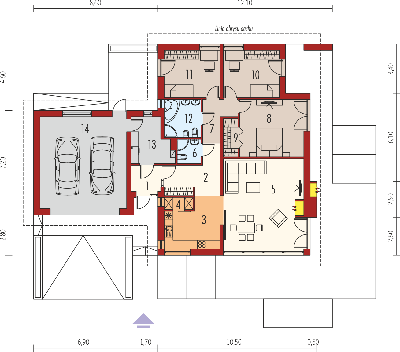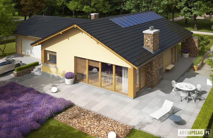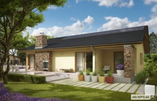 Charakterystyka: dom parterowy, niepodpiwniczony, z garażem dwustanowiskowymPrzeznaczenie: dom dla 4-osobowej rodzinyTechnologia i konstrukcja:Fundamenty: ławy, bloczki betonowe 24 cm, ocieplenie styropian 15 cmŚciany zewnętrzne: murowane, dwuwarstwowe, ceramika poryzowana 24 cm, ocieplenie 20 cmŚciany wewnętrzne: murowane, ceramiczne, ściany nośne 24 cm, ścianki działowe 12 cmPodłoga na gruncie: płyta betonowa, ocieplenie styropian 15 cmStrop i stropodach nad garażem: strop międzypiętrowy gęstożebrowy TerivaDach: konstrukcja drewniana, ocieplenie wełna mineralna 30 cm, dachówka płaska lub inna o podobnych parametrachRozwiązania instalacyjne: Ogrzewanie: kocioł gazowy, rozprowadzenie ciepła: grzejniki Wentylacja: grawitacyjna Wykończenie:Elewacja: tynk cienkowarstwowy mineralny i okładzina kamiennaStolarka: drewniana, PCV lub aluminiowaWersje w serii India - zapytaj o dostępność: - India (wersja A) – wersja podstawowa - India (wersja B) – inne wykończenie elewacji - India (wersja B) reco – instalacje energooszczędne firmy Vaillant: pompa ciepła, wentylacja mechaniczna z rekuperacją, system fotowoltaiczny oraz ogrzewanie podłogowe firmy Purmo- India II (wersja B) – wiązary prefabrykowane, system suchej zabudowy ścian działowych Rigips - wszystkie wersje o takim samym układzie funkcji oraz z inną propozycją wykończenia elewacji - wszystkie wersje z garażem dwustanowiskowym - odbicie lustrzane do każdej wersjiWszystkie wersje domów możliwe w dwóch standardach/wariantach instalacyjnych: - ENERGO: kocioł gazowy kondensacyjny, grzejniki, wentylacja grawitacyjna, OZE: kolektory słoneczne - ENERGO PLUS: pompa ciepła, ogrzewanie podłogowe, wentylacja mechaniczna, OZE: kolektory słoneczne lub panele fotowoltaiczne Istnieją techniczne możliwości wykonania zmian: - podpiwniczenia budynku - wykonania budynku w technologii szkieletowej - zbliźniaczenia lub wykonania domu dwulokalowego - dokonania zmian funkcjonalnych wg indywidualnych wymagańAtuty projektu okiem architekta:- Bardzo dobre parametry cieplne- Ciekawa forma- Subtelna kompozycja elewacji- Dekoracyjnym kamieniem- Kuchnia z praktyczną spiżarnią- Reprezentacyjny salon z kominkiem oferujący wiele możliwości aranżacji- Trzy sypialnie z bezpośrednim dostępem na taras- Główna sypialnia z wydzieloną garderobą- Duże przeszklenia w jadalni z widokiem na ogródek od frontu budynku- Okazały taras z pięknym kominkiem zewnętrznym- Wygodne zadaszenie nad wejściem do budynku jako osłona przed wiatrem i śniegiem- Garaż oddzielony termicznie od ogrzewanej części budynku- Duże pomieszczenie kotłowni pozwala na zastosowanie dowolnego źródła ogrzewania