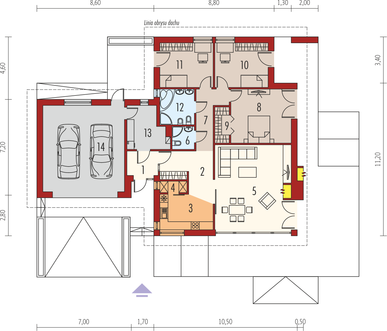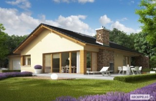 W projekcie zastosowano systemy zabudowy ścian działowych i sufitów podwieszanych Rigips. Więźba dachowa w systemie dachu prefabrykowanego w systemie płytki kolczastej MITEK.Charakterystyka: Dom parterowy, niepodpiwniczony, z garażem dwustanowiskowymPrzeznaczenie: Dom dla 3-4-osobowej rodzinyTechnologia i konstrukcja:Fundamenty: ławy, bloczki betonowe 24 cm, ocieplenie styropian 15 cmŚciany zewnętrzne: murowane, dwuwarstwowe, ceramika poryzowana 24 cm, ocieplenie 20 cmŚciany wewnętrzne: ściana nośna murowana 24 cm, ścianki działowe w systemie suchej zabudowy Rigips 12 cmPodłoga na gruncie: płyta betonowa, ocieplenie styropian 15 cmStrop: pas dolny wiązara stanowi konstrukcję, ocieplenie wełna mineralna 30 cm, sufit podwieszony RigipsDach: wiązary drewniane prefabrykowane, dachówka płaska lub inna o podobnych parametrachRozwiązania instalacyjne: Ogrzewanie: kocioł gazowy, rozprowadzenie ciepła: grzejniki Wentylacja: grawitacyjna Wykończenie:Elewacja: tynk cienkowarstwowy mineralny i okładzina kamiennaStolarka: drewniana, PCV lub aluminiowaWersje w serii India - zapytaj o dostępność: - India (wersja A) – wersja podstawowa - India (wersja B) – inne wykończenie elewacji - India (wersja B) reco – instalacje energooszczędne firmy Vaillant: pompa ciepła, wentylacja mechaniczna z rekuperacją, system fotowoltaiczny oraz ogrzewanie podłogowe firmy Purmo- India II (wersja B) – wiązary prefabrykowane, system suchej zabudowy ścian działowych Rigips - wszystkie wersje o takim samym układzie funkcji oraz z inną propozycją wykończenia elewacji - wszystkie wersje z garażem dwustanowiskowym - odbicie lustrzane do każdej wersjiWszystkie wersje domów możliwe w dwóch standardach/wariantach instalacyjnych: - ENERGO: kocioł gazowy kondensacyjny, grzejniki, wentylacja grawitacyjna, OZE: kolektory słoneczne - ENERGO PLUS: pompa ciepła, ogrzewanie podłogowe, wentylacja mechaniczna, OZE: kolektory słoneczne lub panele fotowoltaiczne Istnieją techniczne możliwości wykonania zmian: - podpiwniczenia budynku - wykonania budynku w technologii szkieletowej - zbliźniaczenia lub wykonania domu dwulokalowego - dokonania zmian funkcjonalnych wg indywidualnych wymagańAtuty projektu okiem architekta:- Szybkie w montażu prefabrykowane elementy dachu z gwarancją jakości, stanowiące jednocześnie konstrukcję stropu, eliminują konieczność stawiania ścian nośnych, fundamentów pod nimi oraz budowy stropu żelbetowego- Ścianki wewnętrzne w technologii lekkiej umożliwiają dowolną aranżację wnętrza- Funkcjonalne i ergonomiczne wnętrze, z podziałem na strefę dzienną i nocną- Wygodna przestronna kuchnia z praktyczną wyodrębnioną spiżarnią- Reprezentacyjny słoneczny salon z podwójnym kominkiem wewnętrznym i zewnętrznym- Główna sypialnia z własną garderobą- Wszystkie sypialnie z dostępem do tarasu- Garaż oddzielony termicznie od ogrzewanej części budynku