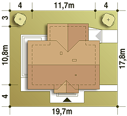 Niewielki, ale wygodny drewniany dom dla 4 – 5-osobowej rodziny. Zlokalizowana na parterze część dzienna mieści w sobie przestronny pokój dzienny z jadalnią, kuchnię, spiżarnię i gabinet. Znajduje się tam też duża kotłownia oraz wc. Na poddaszu znajdują się trzy sypialnie, łazienka i garderoba. Prosta bryła z dwuspadowym dachem czyni dom tanim w realizacji i użytkowaniu.Ściany: szkielet drewniany, Stropy: na belkach drewnianych, Dach: dachówka gontopodobna GERARD CORONA, kąt nachylenia 40°