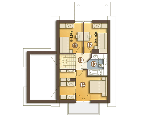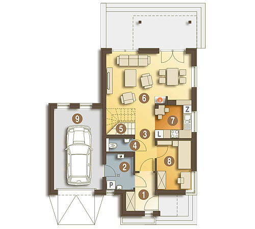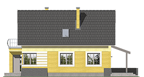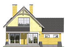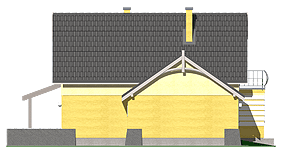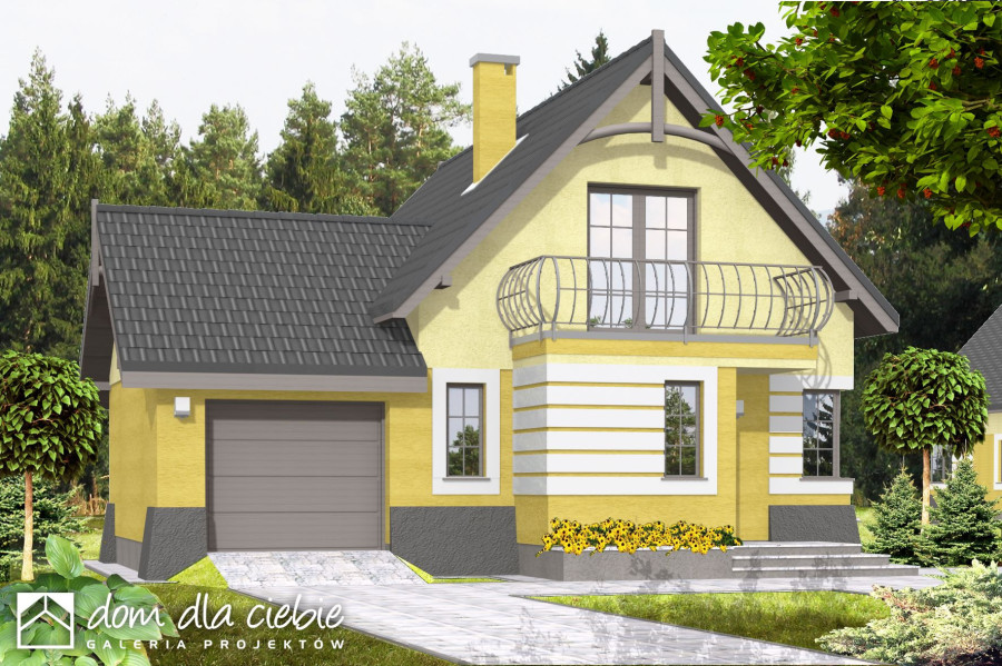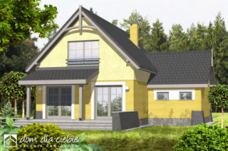 Zgrabny, niewielki dom jednorodzinny, zaprojektowany na wąską działkę, dla 4 osobowej rodziny, nadający się na dom całoroczny lub letniskowy. Drzwi wejściowe chronione są przed opadami funkcjonalnym podcieniem, natomiast jedno z wyjść tarasowych z p. dziennego przestronnym daszkiem na słupach. Z wiatrołapu dostępne jest pom. gospodarcze z piecem C.O., przez które przechodzi się do garażu, zlokalizowanego z boku domu. Kuchnię, w zależności od upodobań inwestorów, można pozostawić otwartą lub zamknąć ściankami działowymi. Na poddaszu zaprojektowano 2 małe sypialnie, jedną większą z wewnętrzną garderobą oraz łazienkę. Wszystkie pomieszczenia, w wersji bez garażu, doświetlone są światłem dziennym.