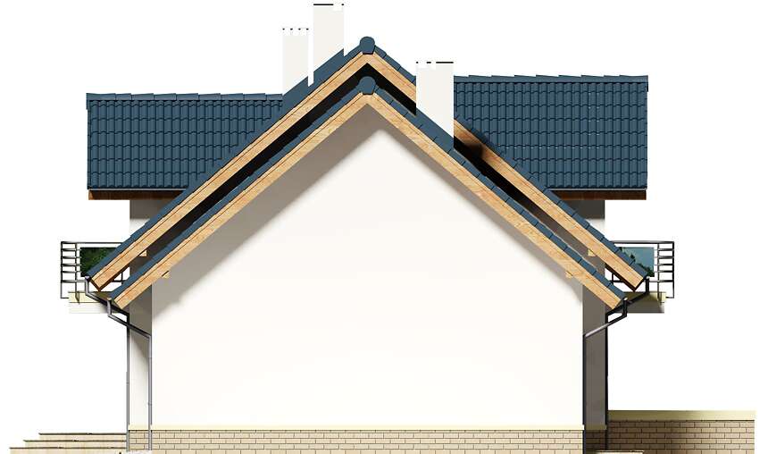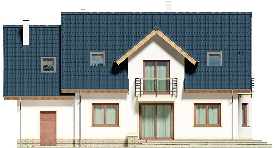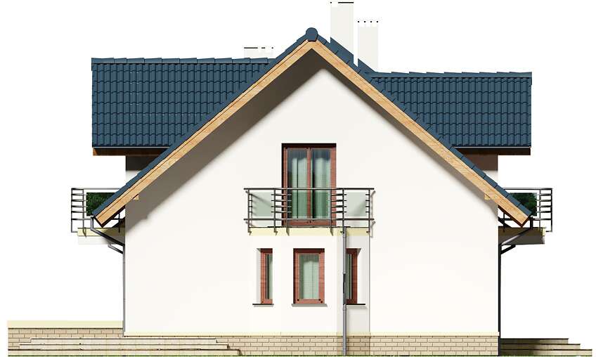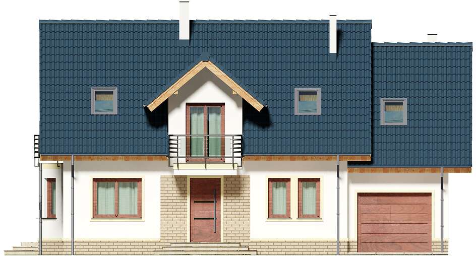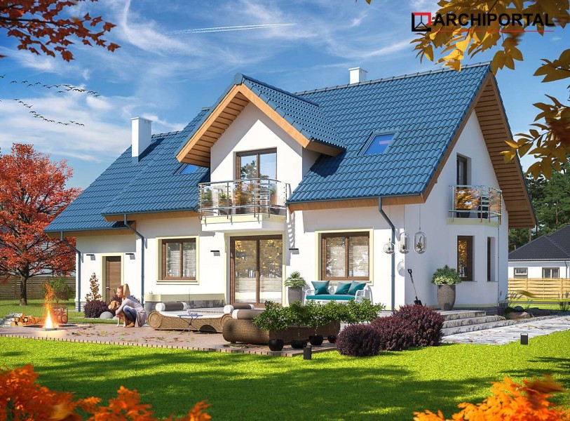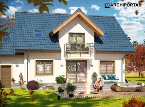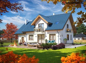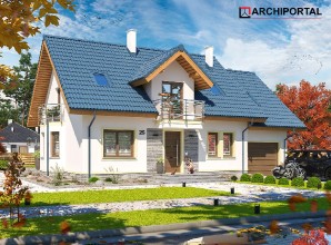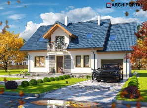 Projekt klasycznego domu z dwuspadowym dachem, w którym wygonie zamieszka 4-5 osobowa rodzina. Do dyspozycji mieszkańców jest duża otwarta kuchnia (w razie potrzeby można ją zamknąć ścianką działową). Nie zapomniano w niej o miejscu pod zabudowę sprzętem AGD i praktycznej spiżarni. Duży, przestronny salon z ciekawym wykuszem jadalnym jest doskonałym miejscem wypoczynku w ciągu dnia, a centralne położenie kominka nadaje całości przytulnego charakteru i doskonale sprawdzi się podczas ogrzewania domu w zimie. Bezpośrednio z pokojem dziennym sąsiaduje dodatkowy pokój, który może pełnić funkcję gabinetu lub pokoju gościnnego. Do garażu dostajemy się przez praktyczne pomieszczenie gospodarcze, w pobliżu którego znalazła się niewielka łazienka. Za garażem znajduje się kotłownia, z bezpośrednim wyjściem na ogród. Jej duża powierzchnia pozwala rozważać inny sposób ogrzewania niż gazowe. Poddasze to typowa strefa nocna. Znajdują się tu 3 ustawne pokoje oraz duża łazienka. Prawdziwą zaletą jest jednak pomieszczenie znajdujące się nad garażem. Zostało ono podzielone na dwie części. Do jednej dostajemy się wprost z pokoju rodziców i może ona stanowić, dodatkową garderobę. Drugą część, dostępną z klatki schodowej, można przerobić na gabinet, pokój hobby, lub po prostu dodatkowe pomieszczenie mieszkalne. Pomieszczenia te mogą być też połączone, tworząc jedno duże. Dom ma nieskomplikowaną bryłę i prosty dach, dzięki czemu będzie tani w budowie i późniejszej eksploatacji.