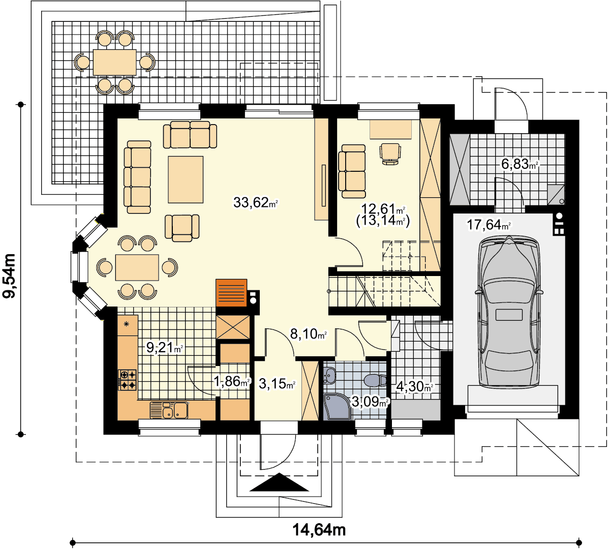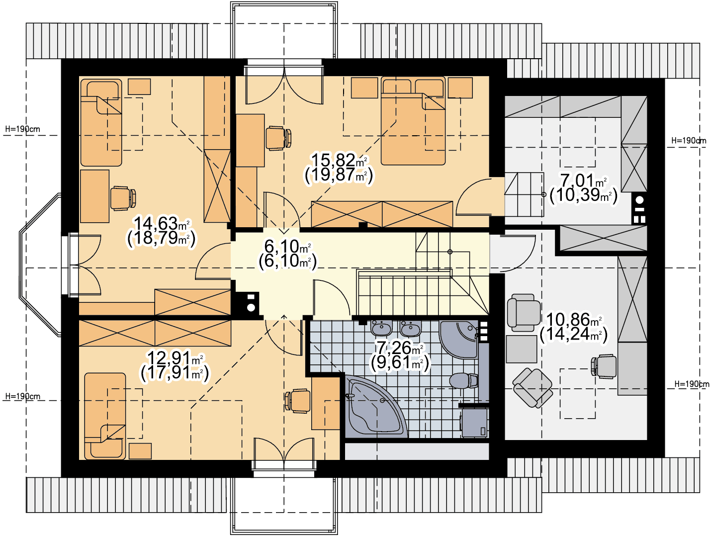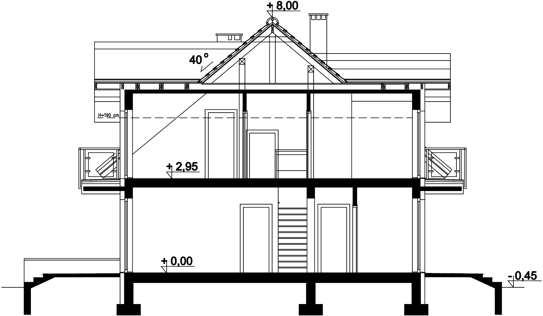 Projekt klasycznego domu z dwuspadowym dachem, w którym wygonie zamieszka 4-5 osobowa rodzina. Do dyspozycji mieszkańców jest duża otwarta kuchnia (w razie potrzeby można ją zamknąć ścianką działową). Nie zapomniano w niej o miejscu pod zabudowę sprzętem AGD i praktycznej spiżarni. Duży, przestronny salon z ciekawym wykuszem jadalnym jest doskonałym miejscem wypoczynku w ciągu dnia, a centralne położenie kominka nadaje całości przytulnego charakteru i doskonale sprawdzi się podczas ogrzewania domu w zimie. Bezpośrednio z pokojem dziennym sąsiaduje dodatkowy pokój, który może pełnić funkcję gabinetu lub pokoju gościnnego. Do garażu dostajemy się przez praktyczne pomieszczenie gospodarcze, w pobliżu którego znalazła się niewielka łazienka. Za garażem znajduje się kotłownia, z bezpośrednim wyjściem na ogród. Jej duża powierzchnia pozwala rozważać inny sposób ogrzewania niż gazowe. Poddasze to typowa strefa nocna. Znajdują się tu 3 ustawne pokoje oraz duża łazienka. Prawdziwą zaletą jest jednak pomieszczenie znajdujące się nad garażem. Zostało ono podzielone na dwie części. Do jednej dostajemy się wprost z pokoju rodziców i może ona stanowić, dodatkową garderobę. Drugą część, dostępną z klatki schodowej, można przerobić na gabinet, pokój hobby, lub po prostu dodatkowe pomieszczenie mieszkalne. Pomieszczenia te mogą być też połączone, tworząc jedno duże. Dom ma nieskomplikowaną bryłę i prosty dach, dzięki czemu będzie tani w budowie i późniejszej eksploatacji.