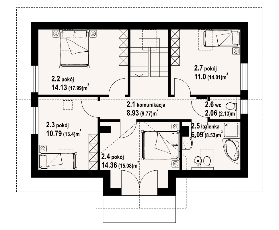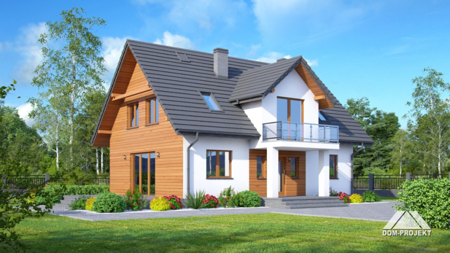Dom z poddaszem użytkowym. Duży salon z aneksem kuchennym, kominkiem, wyjściem na taras i schodami na poddasze. Pokój biblioteka, wc, wiatrołap, spiżarka i kotłownia. Na poddaszu cztery pokoje, łazienka, wc, komunikacja i dwa balkony. Zwarta bryła budynku i dach dwuspadowy sprzyjają szybkiej i taniej budowie i niskim kosztom eksploatacji.