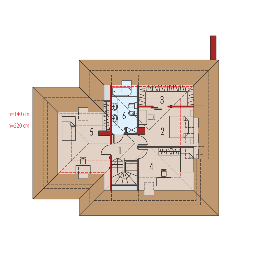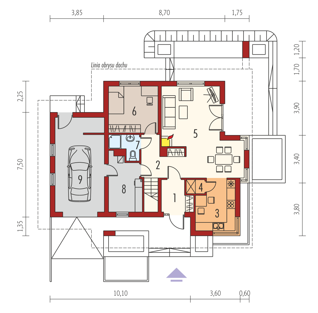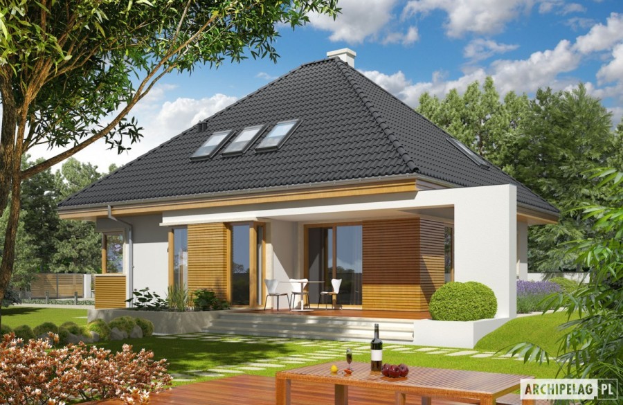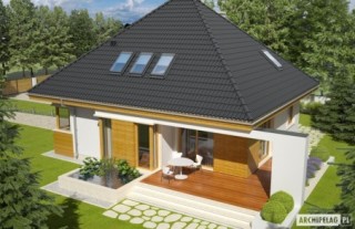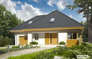 Charakterystyka: Dom parterowy z poddaszem użytkowym, niepodpiwniczony, z garażem jednostanowiskowymPrzeznaczenie: Dom dla 4-5-osobowej rodziny Technologia i konstrukcja:Ściany zewnętrzne: murowane, dwuwarstwowe, beton komórkowy 24 cm, ocieplenie 12 cmŚciany wewnętrzne: murowane, cegławapienno-piaskowa 24 cm i 12 cmStrop: strop międzypiętrowy gęstożebrowy TerivaDach: konstrukcja drewniana, ocieplenie wełna mineralna 25 cm, dachówka ceramiczna firmy RöbenInne: schody wewnętrzne drewniane Rozwiązania instalacyjne:Ogrzewanie: kocioł gazowy, rozprowadzenie ciepła: grzejnikiWentylacja: grawitacyjna Wykończenie:Elewacje: tynk cienkowarstwowy mineralny, okładzina drewnianaStolarka: drewniana, PVC lub aluminiowaOkna połaciowe: rozwiązania technologiczne i wyłaz dachowy firmy FAKRO Wersje - zapytaj o dostępność:- Jarek II – z garażem dwustanowiskowym- Jarek – podobny układ funkcjonalny, inne wykończenie elewacji, różne wersje garaży- odbicie lustrzane do każdej wersji Istnieje techniczna możliwość:- podpiwniczenia budynku- wykonania budynku w technologii szkieletowej Atuty projektu okiem architekta:- Połączenie tradycyjnej bryły z nowoczesnym wykończeniem- Funkcjonalne i ergonomiczne wnętrze z podziałem na strefę dzienną na parterze i nocną na poddaszu- Kuchnia z praktyczną spiżarnią- Główna sypialnia z garderobą- Funkcjonalne szafy wnękowe- Wygodne zadaszenie nad wejściem do budynku jako osłona przed wiatrem i śniegiem