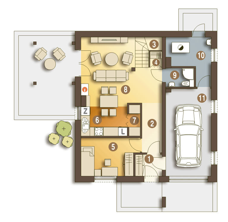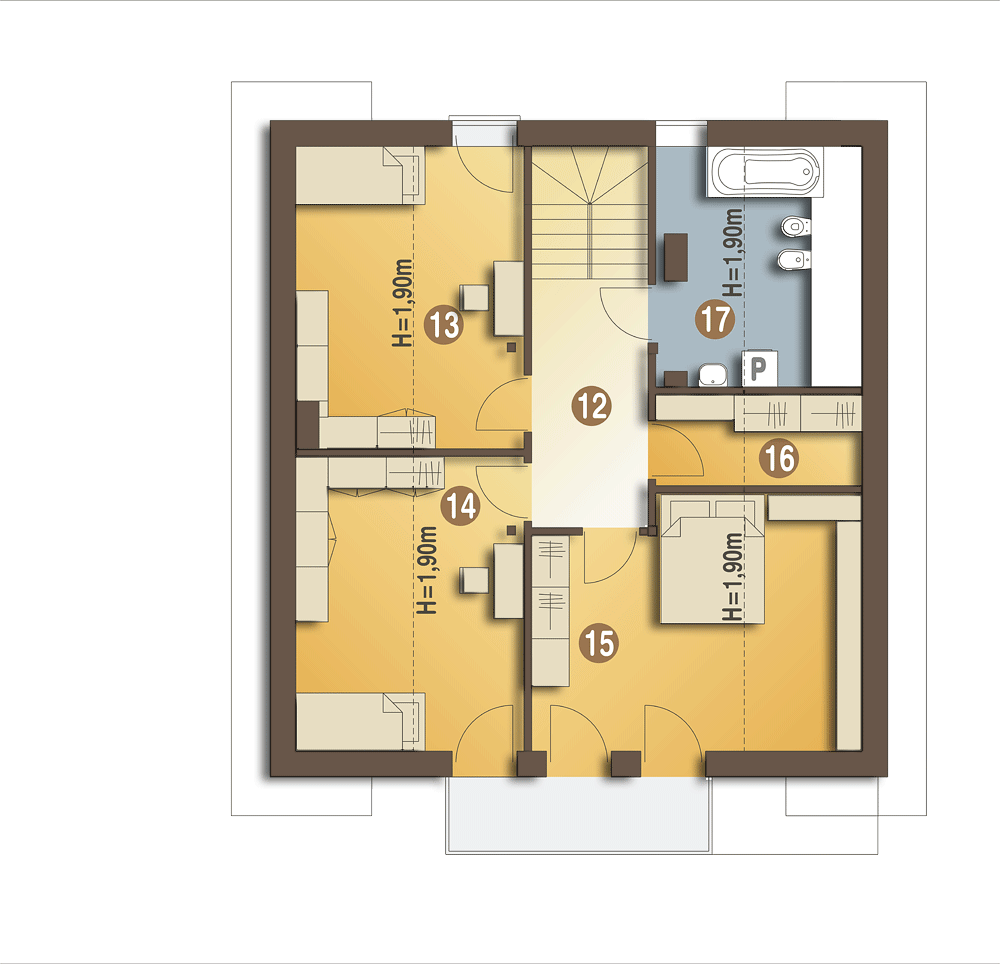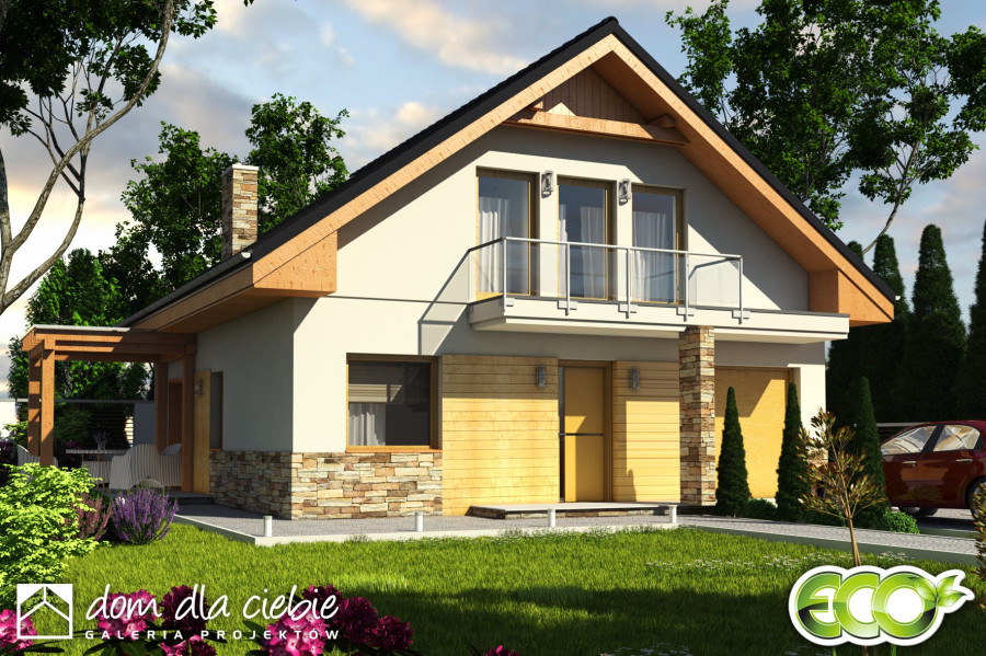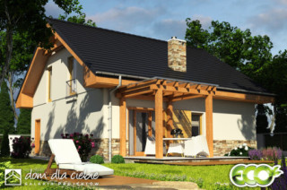Jarząbek to mały domek idealny dla 3-4 osobowej rodziny. Zaprojektowany z myślą o ekonomicznej budowie i użytkowaniu. Parter zawiera w sobie salon z kuchnią (niewielka spiżarnia przy kuchni), pokój gościnny, wiatrołap, hol, łazienkę z natryskiem, garderobę pod schodami oraz garaż i kotłownię na paliwo stałe. Na poddasze prowadzą wygodne schody. Poddasze mieści w sobie sporą łazienkę oraz trzy sypialnie i garderobę. Architektura Jarząbka łączy w sobie elementy tradycyjne i nowoczesne.fundamenty: BETONOWE ściany zewnętrzne: POROTHERM+STYROPIAN TERMO ORGANIKA rodzaj stropu: TERIVA I elewacje: TYNK STRUKTURALNY pokrycie dachu: DACHÓWKA CEM. lub CER.