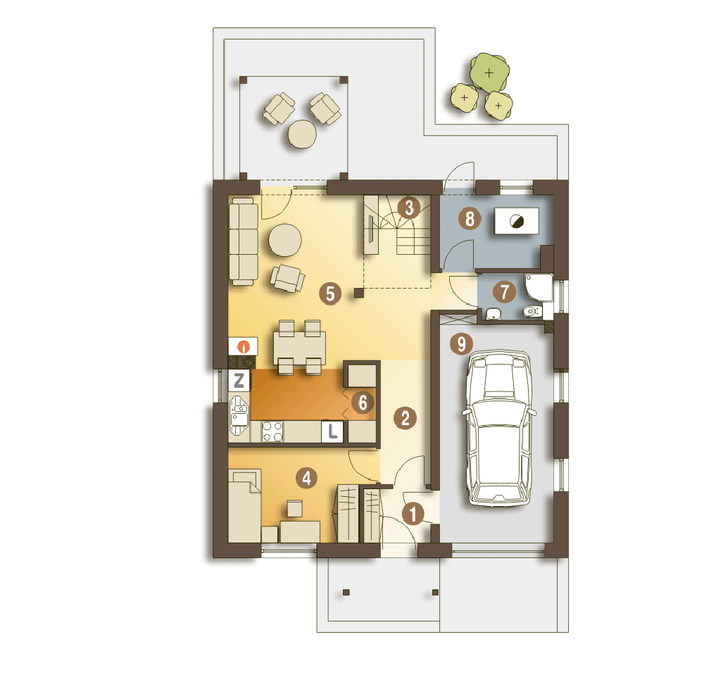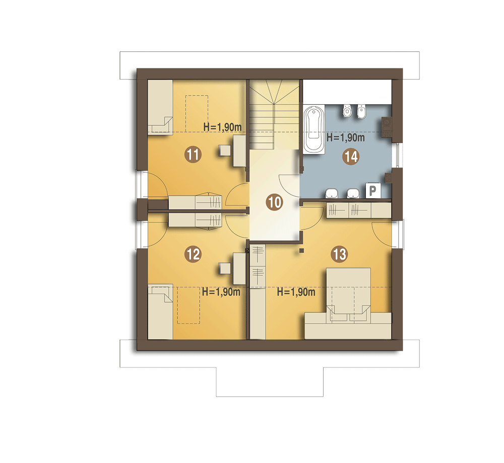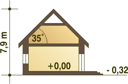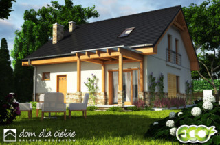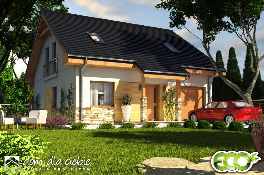 Jarząbek II to mały domek w układzie kalenicowym, zaprojektowany z myślą o ekonomicznej budowie o użytkowaniu dla 3-4 osobowej rodziny. Parter zawiera w sobie salon z kuchnią (niewielka spiżarnia przy kuchni), pokój gościnny, wiatrołap, hol, łazienkę z natryskiem oraz garaż i kotłownię na paliwo stałe. Na poddasze prowadzą wygodne schody. Poddasze mieści w sobie sporą łazienkę oraz trzy sypialnie. Architektura Jarząbka II łączy w sobie elementy tradycyjne i nowoczesne.fundamenty: BETONOWE ściany zewnętrzne: POROTHERM+STYROPIAN TERMO ORGANIKA rodzaj stropu: TERIVA I elewacje: TYNK STRUKTURALNY pokrycie dachu: DACHÓWKA CEM. lub CER.