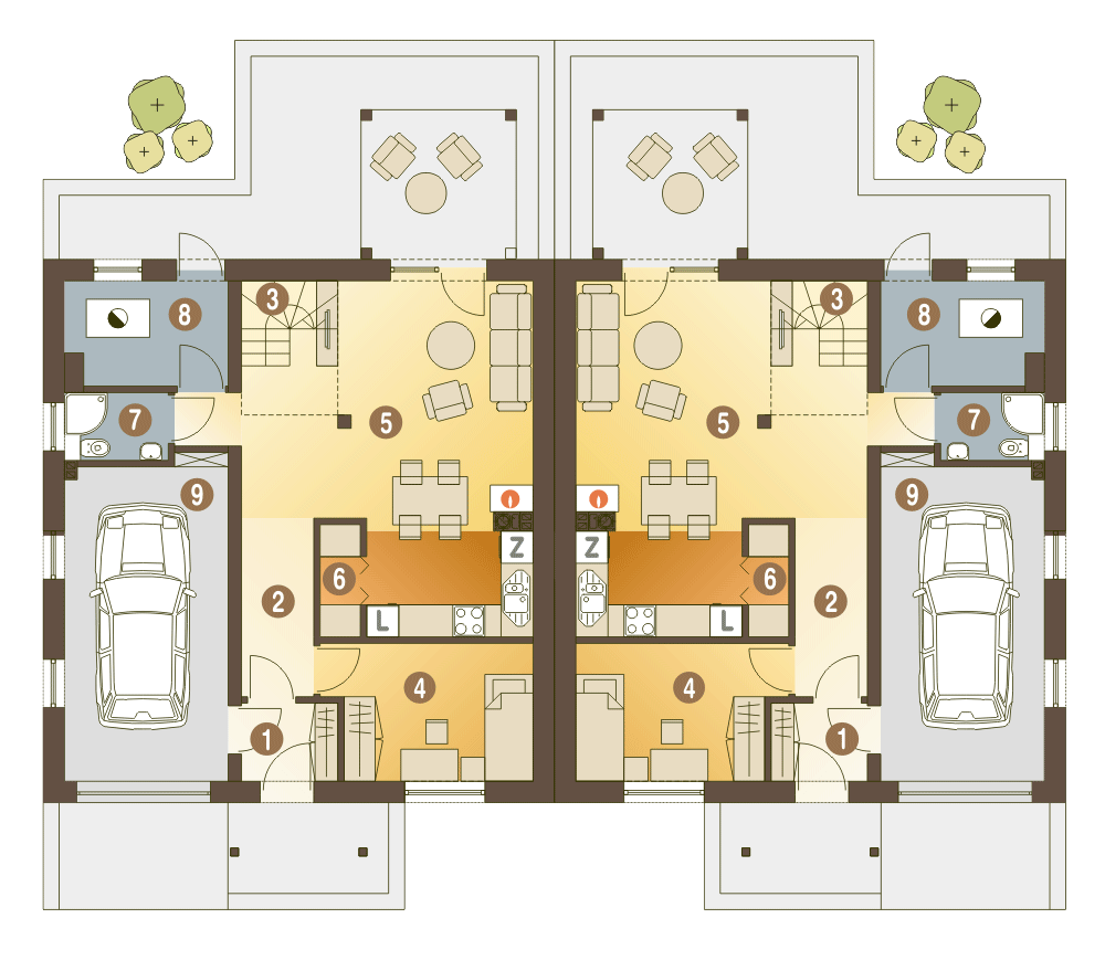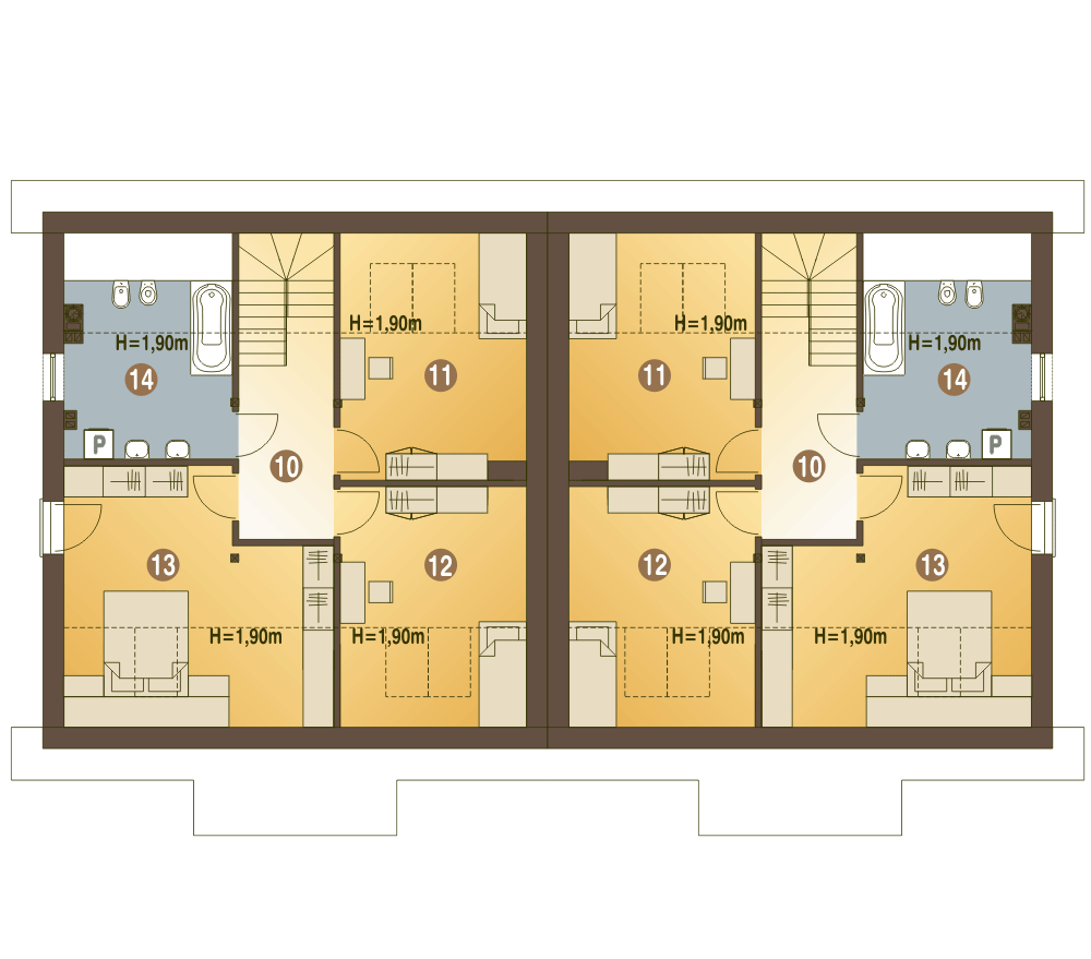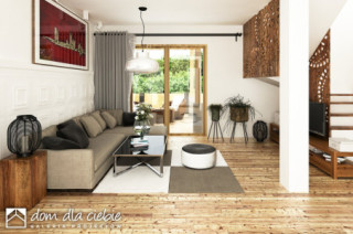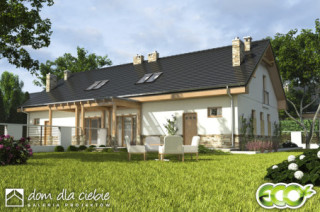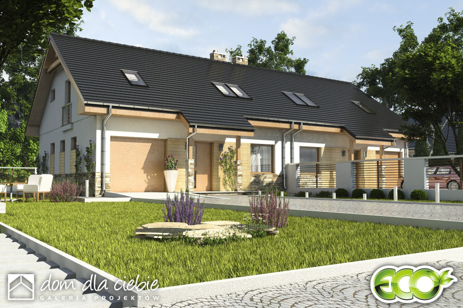 (Uwaga: projekty typu bliźniak oferujemy jako domy dwulokalowe, projekt można zamówić również w zabudowie bliźniaczej) Jarząbek II A-BL2 powstał z połączenia dwóch segmentów budynku (lewy i prawy) ścianami szczytowymi od strony salonów. Poniższy opis dotyczy jednego segmentu.Jarząbek II to mały domek w układzie kalenicowym, zaprojektowany z myślą o ekonomicznej budowie o użytkowaniu dla 3-4 osobowej rodziny. Parter zawiera w sobie salon z kuchnią (niewielka spiżarnia przy kuchni), pokój gościnny, wiatrołap, hol, łazienkę z natryskiem oraz garaż i kotłownię na paliwo stałe. Na poddasze prowadzą wygodne schody. Poddasze mieści w sobie sporą łazienkę oraz trzy sypialnie. Architektura Jarząbka II łączy w sobie elementy tradycyjne i nowoczesne.