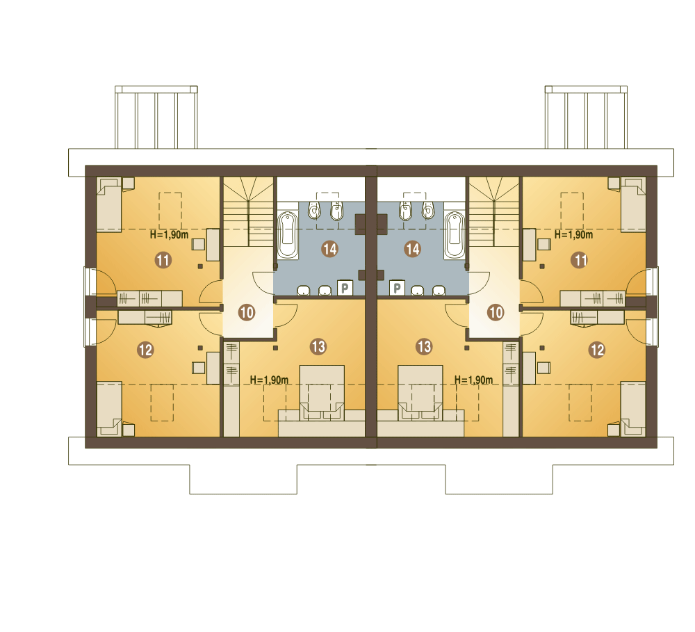 (Uwaga: projekty typu bliźniak oferujemy jako domy dwulokalowe, projekt można zamówić również w zabudowie bliźniaczej) Jarząbek III A-BL1 powstał poprzez połączenie dwóch segmentów (wariantu podstawowego i jego odbicia lustrzanego) od strony garaży. Opis poniżej dotyczy jednego segmentu:Jarząbek III to wygodny domek w układzie kalenicowym, zaprojektowany z myślą o ekonomicznej budowie o użytkowaniu dla 3-4 osobowej rodziny. Parter zawiera w sobie salon z kuchnią (niewielka spiżarnia przy kuchni), pokój gościnny, wiatrołap, hol, łazienkę z natryskiem oraz garaż i kotłownię na paliwo stałe. Na poddasze prowadzą wygodne schody. Poddasze mieści w sobie sporą łazienkę oraz trzy sypialnie. Architektura Jarząbka III łączy w sobie elementy tradycyjne i nowoczesne.fundamenty: BETONOWE ściany zewnętrzne: BLOCZKI SILIKATOWE+STYROPIAN TERMO ORGANIKA rodzaj stropu: MONOLITYCZNY elewacje: TYNK STRUKTURALNY pokrycie dachu: DACHÓWKA CEM. lub CER.