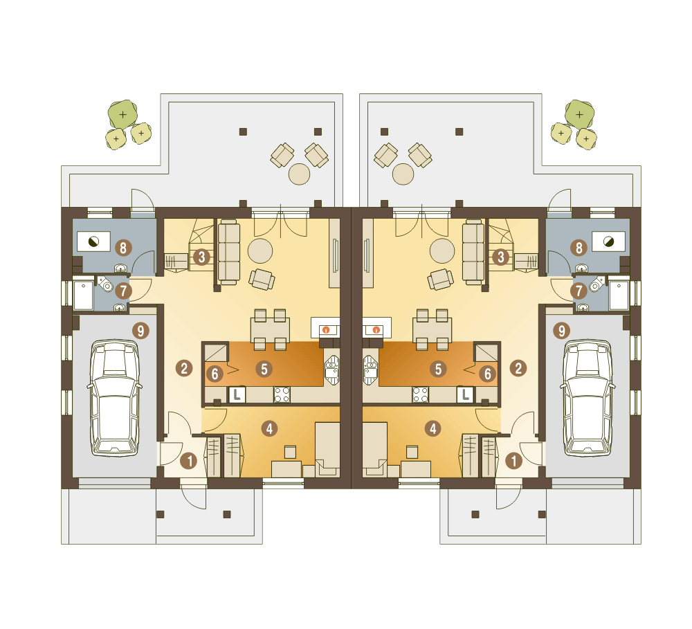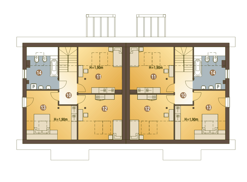 (Uwaga: projekty typu bliźniak oferujemy jako domy dwulokalowe, projekt można zamówić również w zabudowie bliźniaczej) Jarząbek III A-BL2 powstał poprzez połączenie dwóch segmentów (wariantu podstawowego i jego odbicia lustrzanego) od strony garaży. Opis poniżej dotyczy jednego segmentu:Jarząbek III to wygodny domek w układzie kalenicowym, zaprojektowany z myślą o ekonomicznej budowie o użytkowaniu dla 3-4 osobowej rodziny. Parter zawiera w sobie salon z kuchnią (niewielka spiżarnia przy kuchni), pokój gościnny, wiatrołap, hol, łazienkę z natryskiem oraz garaż i kotłownię na paliwo stałe. Na poddasze prowadzą wygodne schody. Poddasze mieści w sobie sporą łazienkę oraz trzy sypialnie. Architektura Jarząbka III łączy w sobie elementy tradycyjne i nowoczesne.