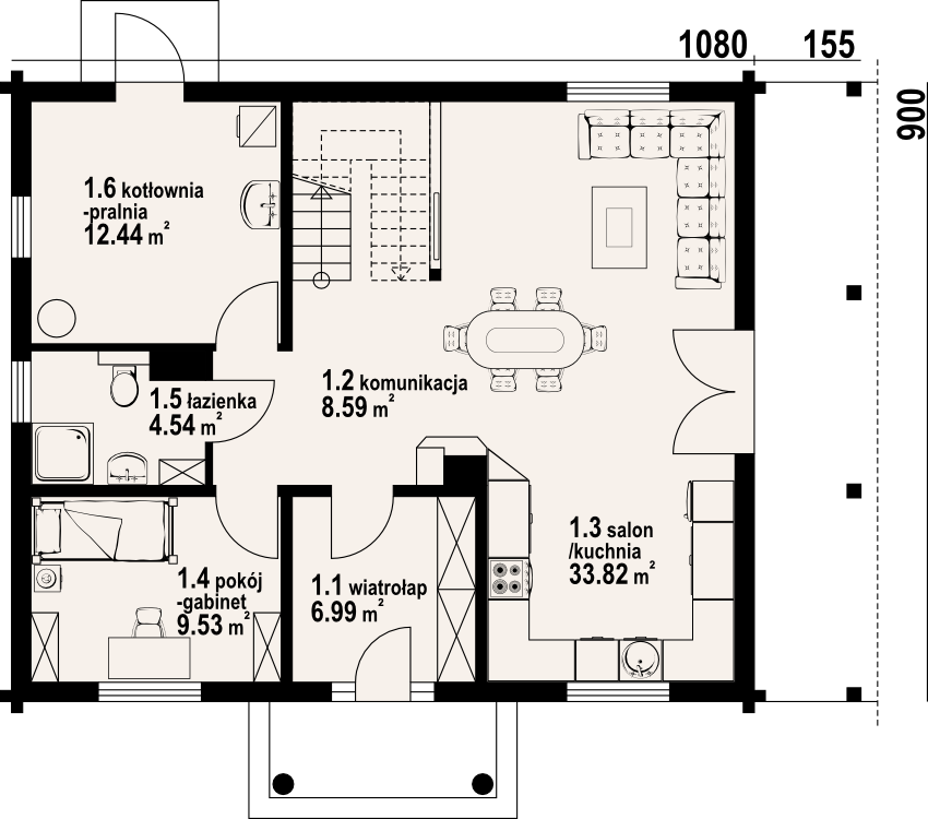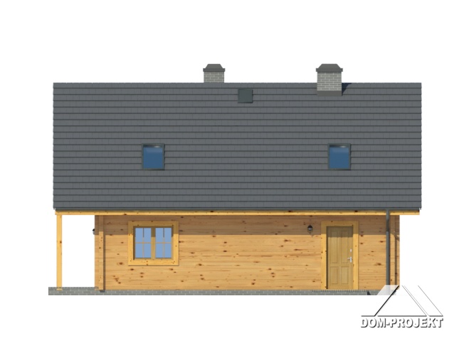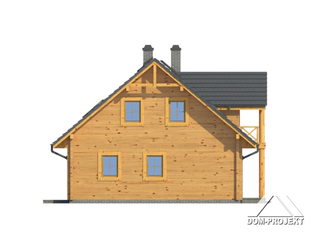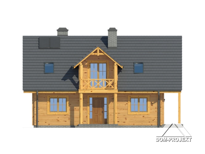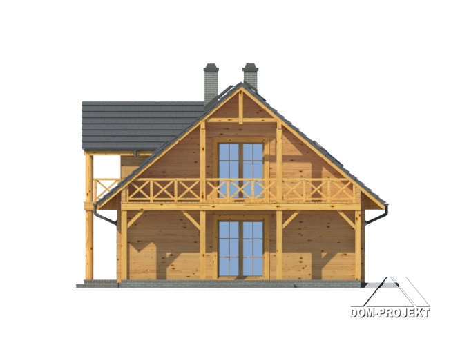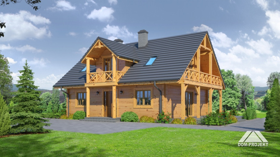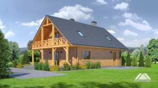 Dom z bali drewnianych. Duży salon z aneksem kuchennym, kominkiem, wyjściem na zadaszony taras, schodami na poddasze. Pokój, wiatrołap, łazienka i kotłownia. Na poddaszu trzy pokoje, łazienka, garderoba i komunikacja. Dwa balkony. Zwarta bryła budynku i dach dwuspadowy sprzyjają taniej i szybkiej budowie oraz niskim kosztom eksploatacji.