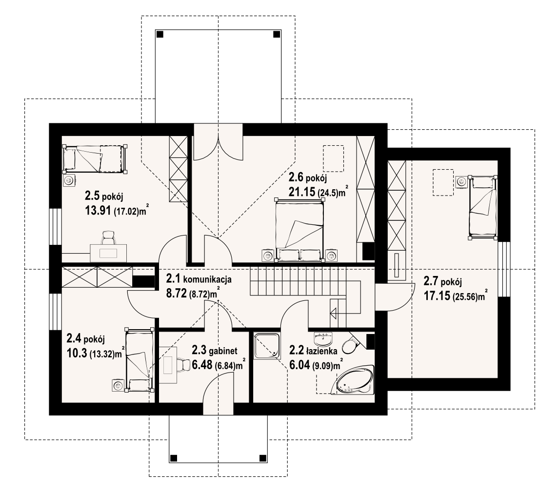 Całkowicie podpiwniczony, przestronny i funkcjonalny dom z dobudowanym garażem. Salon z kominkiem, oraz z aneksem kuchennym. Gabinet na parterze i poddaszu. Ponadto na poddaszu cztery sypialnie. Duże balkony, zadaszony taras.
