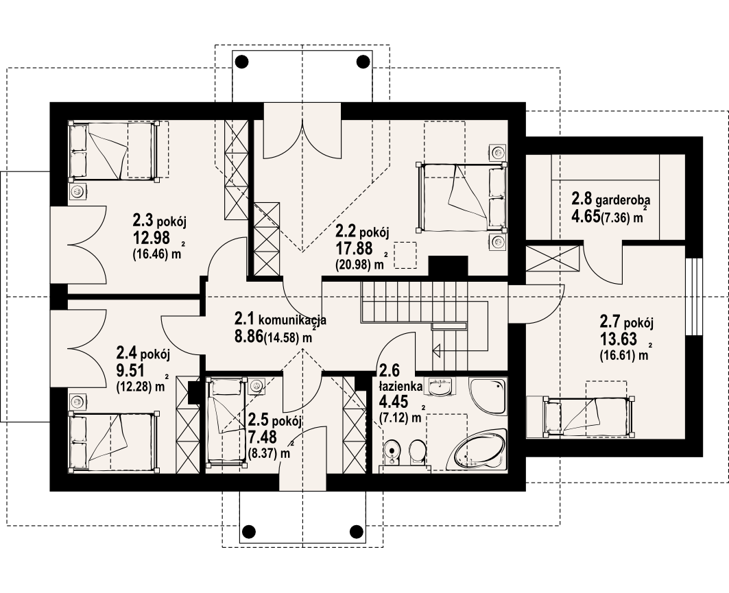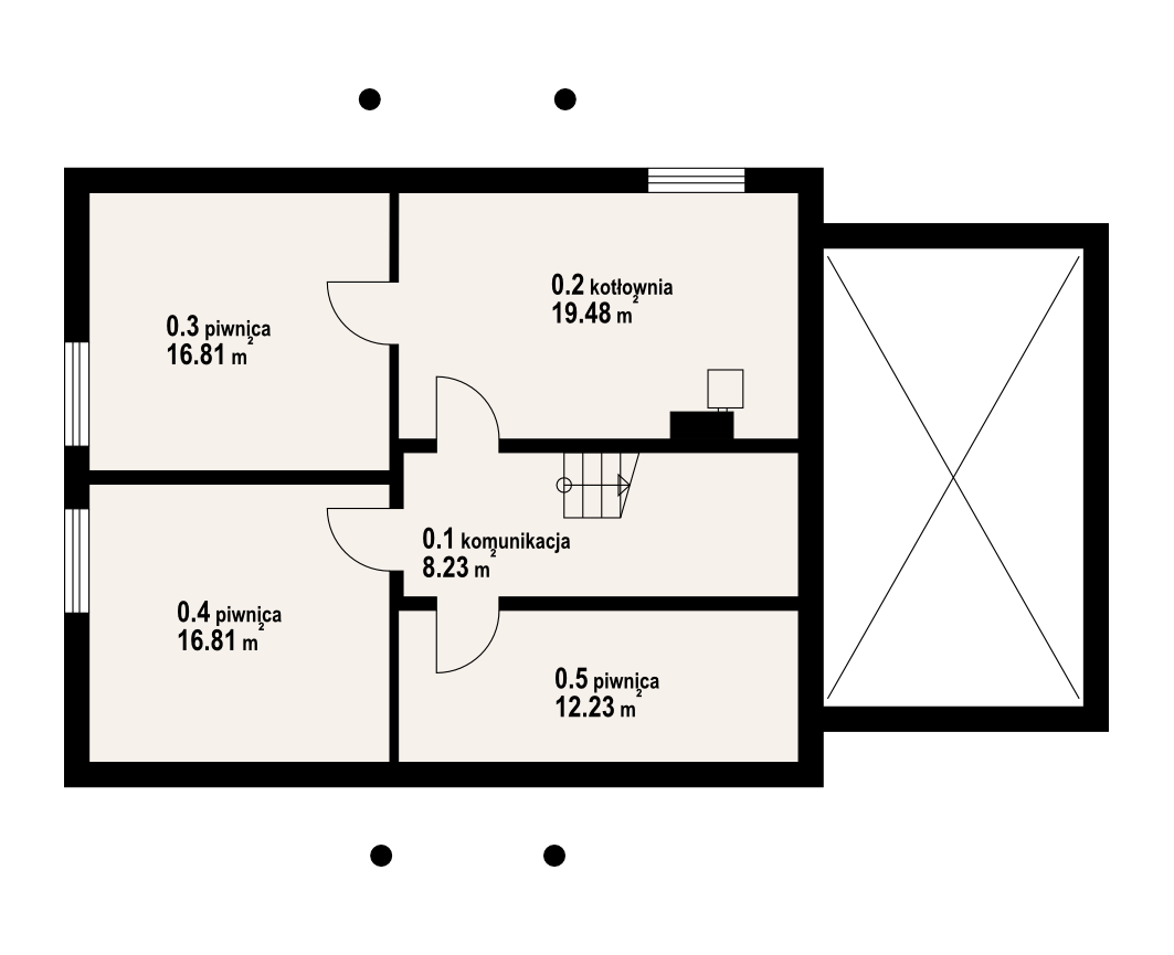 Interesujący dom z podpiwniczeniem o układzie funkcjonalnym przeznaczonym dla cztero-sześcioosobowej rodziny. Na parterze duży salon z kominkiem, wydzielona kuchnia z spiżarką, oraz łazienka. Garaż dostępny bezpośrednio z budynku. Poddasze to pięć sypialni, w tym jedna z garderobą i łazienka. W podpiwniczeniu zaplecze gospodarcze.