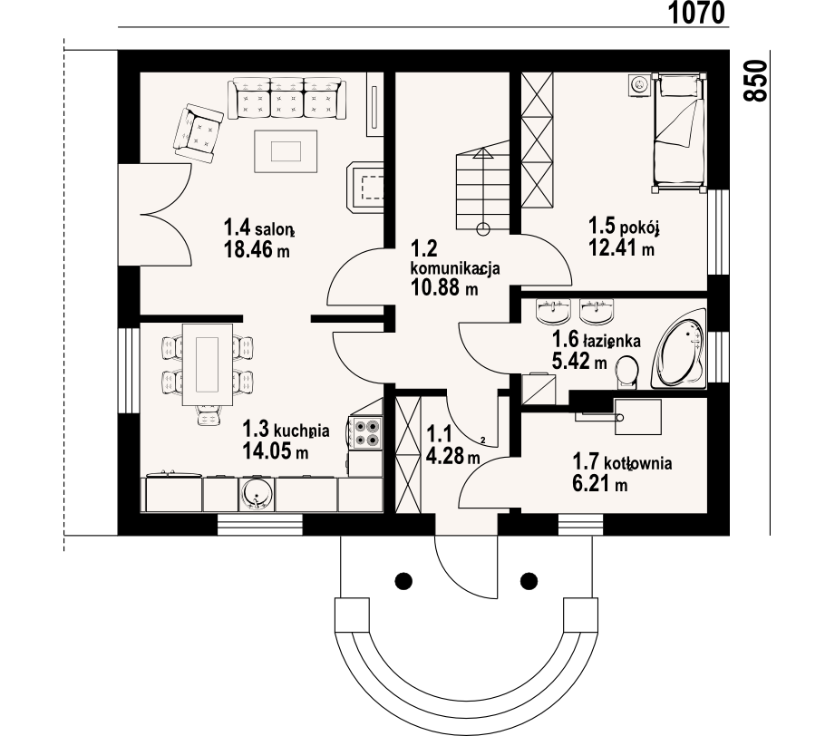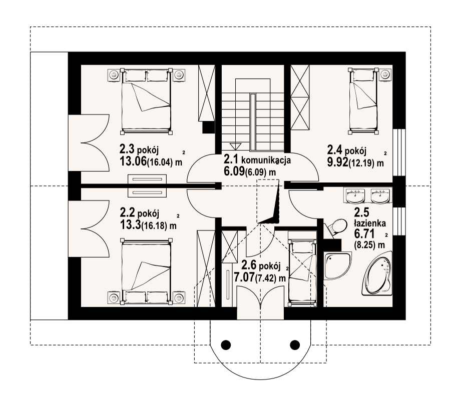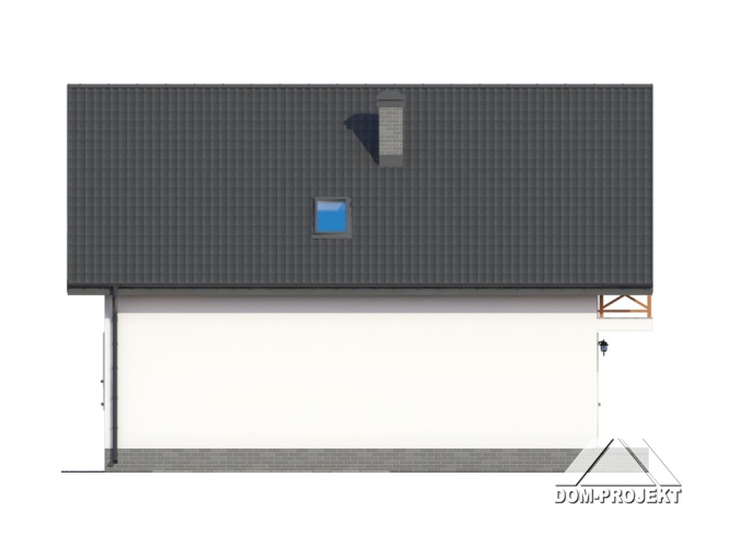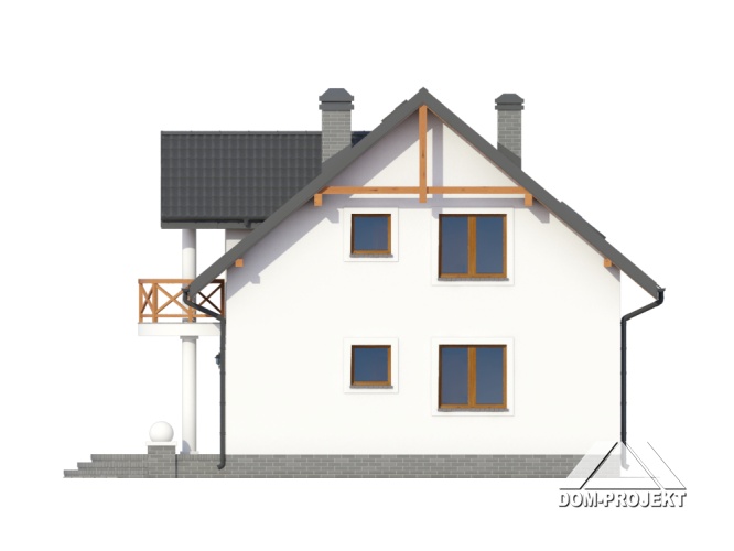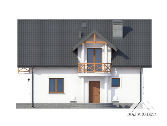 Dom z poddaszem. Salon (z kominkiem i wyjściem na taras), kuchnia, pokój, łazienka, komunikacja, wiatrołap i kotłownia. Na poddaszu cztery pokoje, łazienka, komunikacja i dwa balkony. Zwarte bryła budynku i dach dwuspadowy sprzyjają taniej i szybkiej budowie i niskim kosztom eksploatacji.