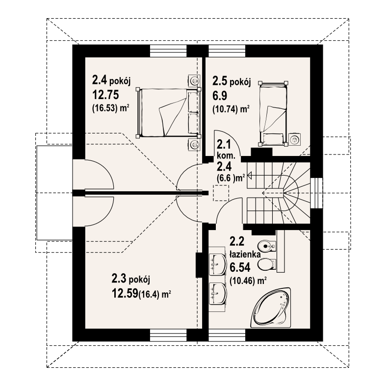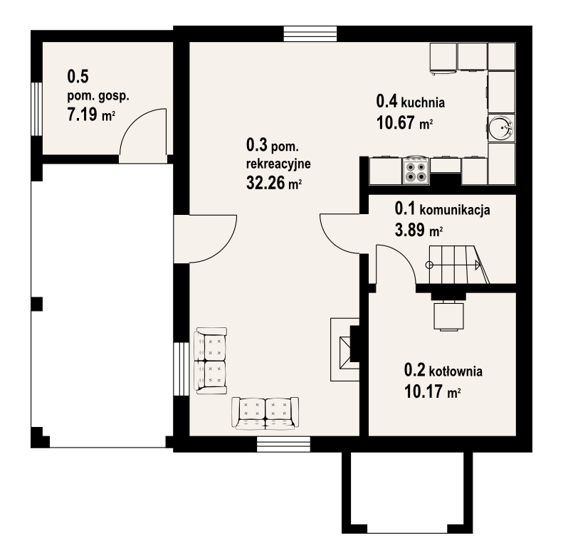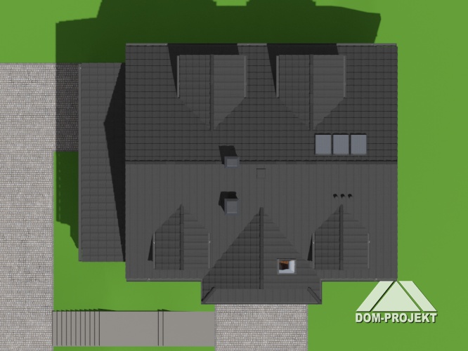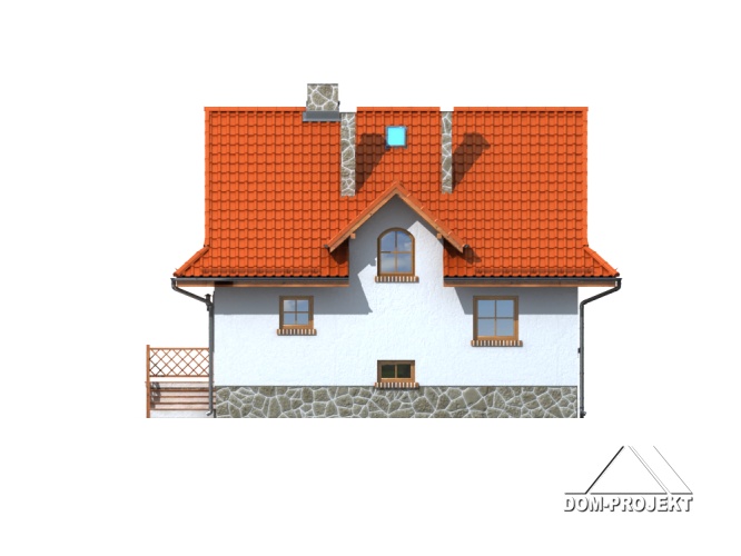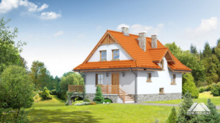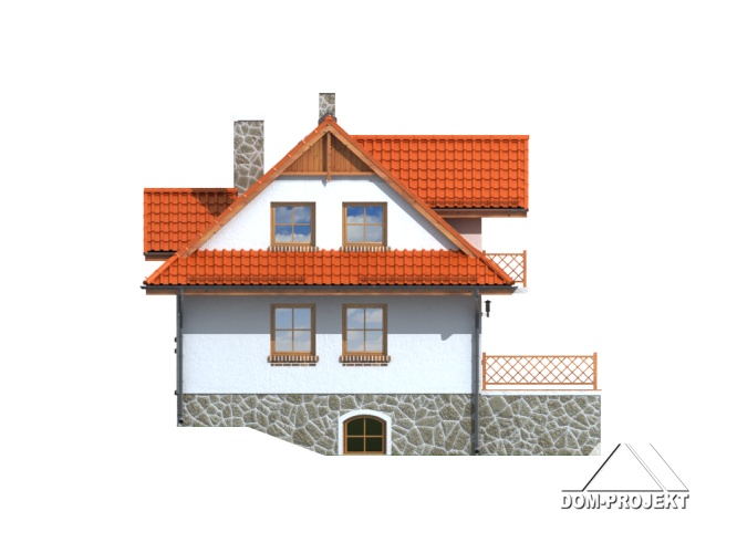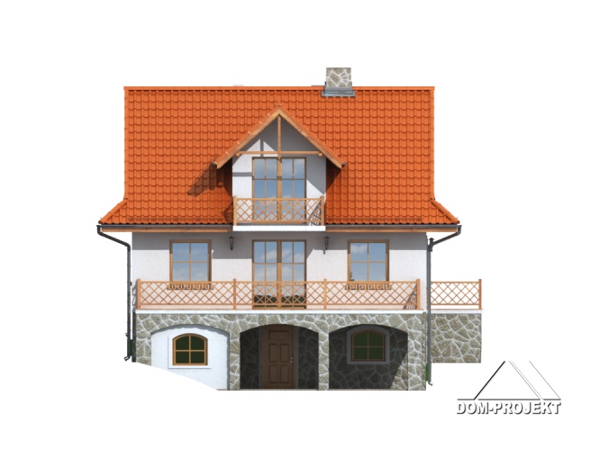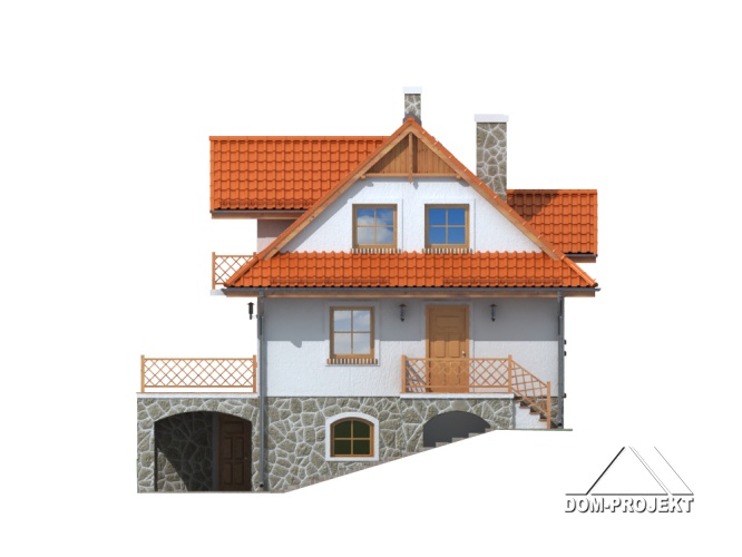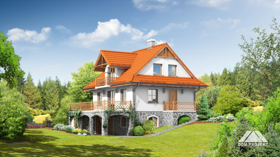 Dom na działkę ze spadkiem terenu. Wyjątkowo duży taras, a pod nim miejsce na samochód pod łukami. W piwnicach pomieszczenia gospodarcze, a także kuchnia letnia i pomieszczenie wypoczynkowe z wyjściem do ogrodu. Na parterze duży salon z aneksem kuchennym, kominkiem i wyjściem na taras, łazienka, wiatrołap i schody. Na poddaszu trzy sypialnie i duża łazienka. Liczne wersje projektu w tym wersja drewniana z bali.