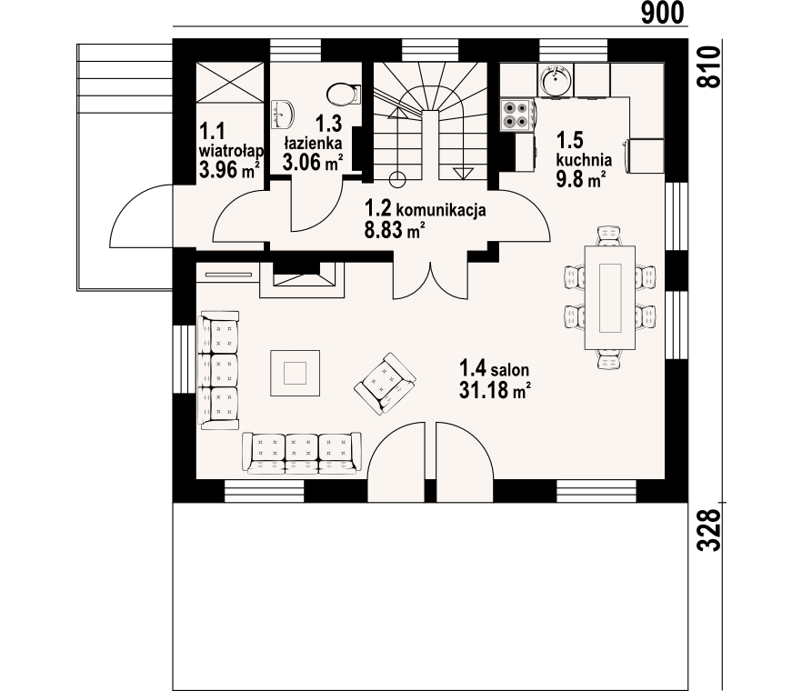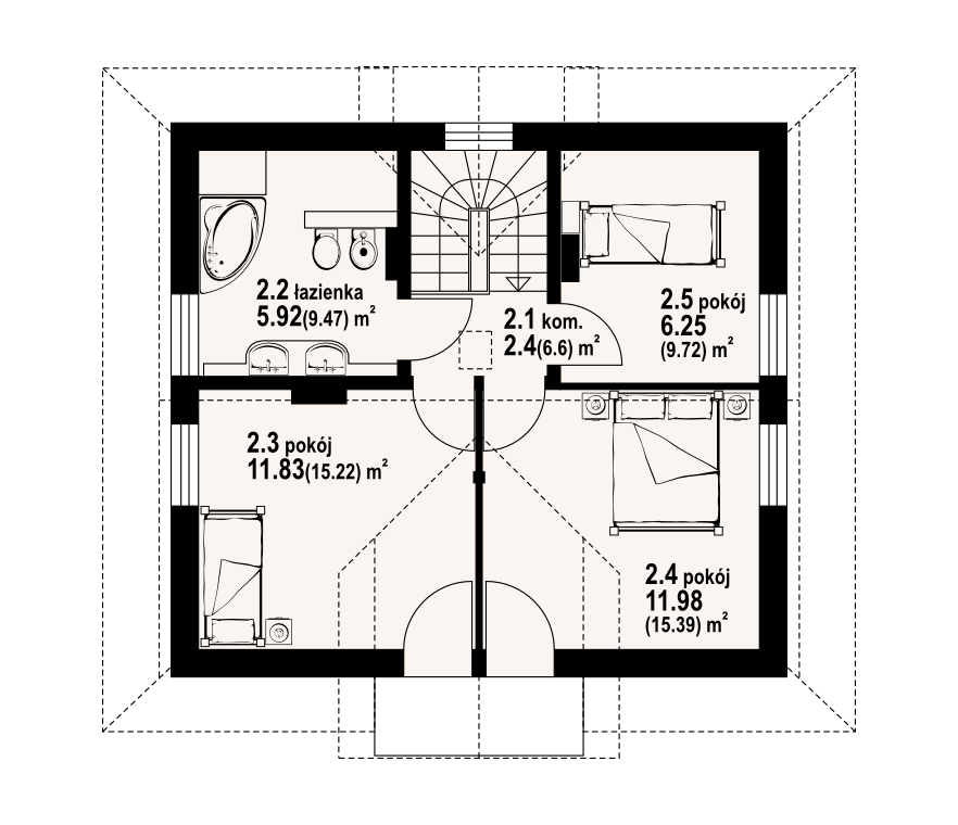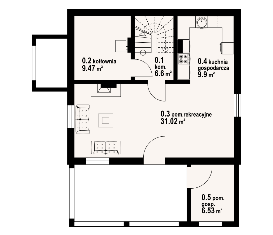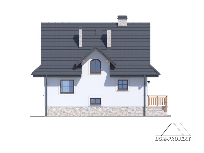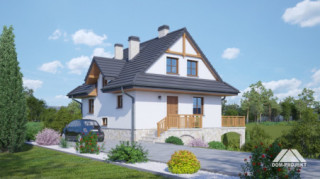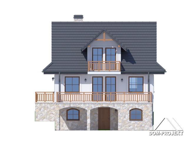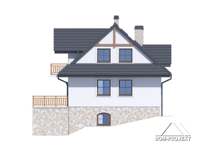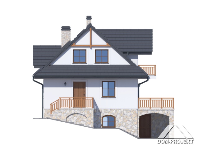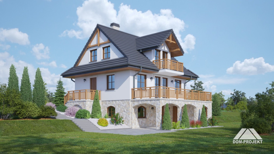 Dom podpiwniczony z poddaszem mieszkalnym. Na parterze duży salon z aneksem kuchennym, kominkiem i wyjściem na duży taras. Wiatrołap, komunikacja. Na poddaszu trzy pokoje, łazienka, balkon i komunikacja. W piwnicach pomieszczenie rekreacyjne, kuchnia gospodarcza, pomieszczenie gospodarcze, kotłownia i komunikacja. Zwarta bryła budynku i duże tarasy. Dom idealny do usytuowania na działkach ze spadkiem terenu.