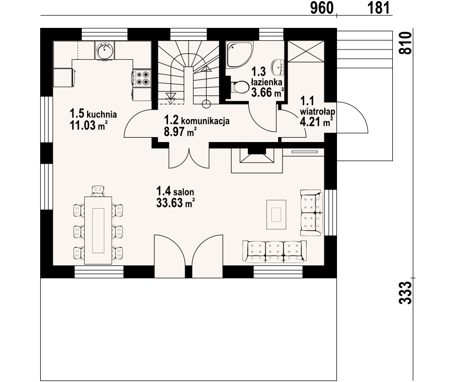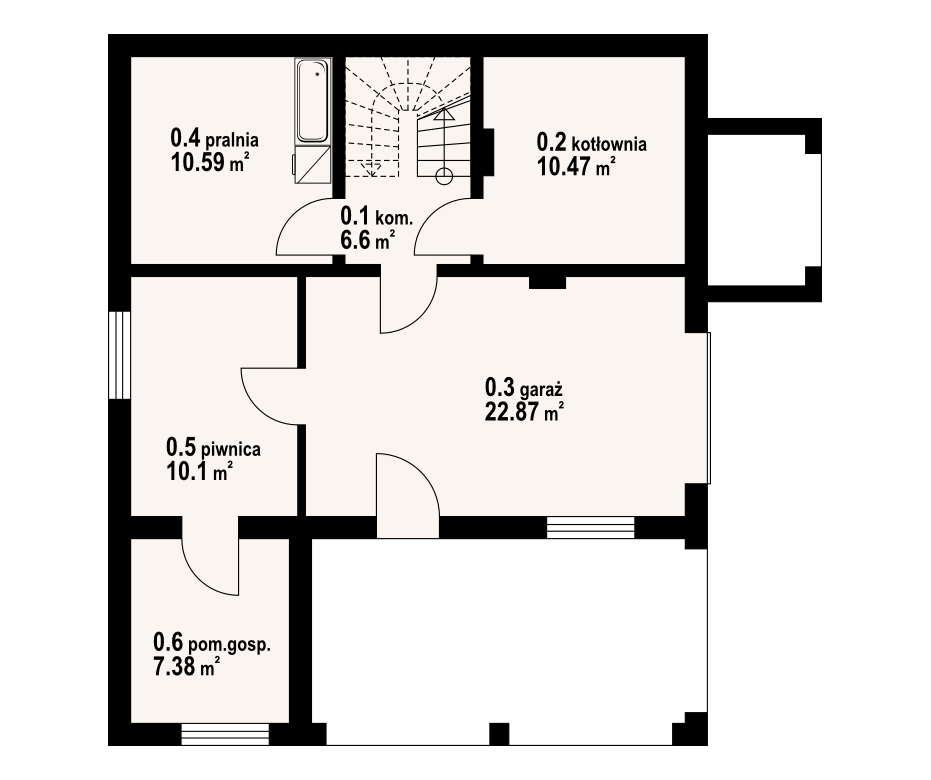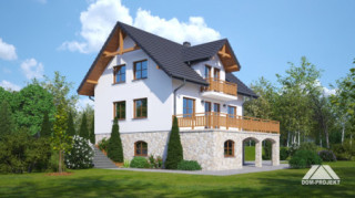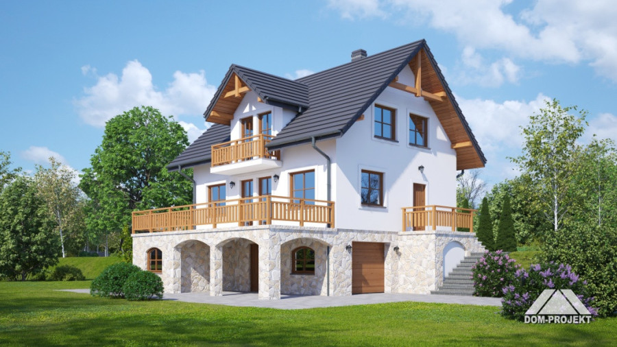 Dom podpiwniczony, idealnie nadający się do realizacji na działce ze spadkiem terenu. Na parterze przestronny salon z aneksem kuchennym, kominkiem i wyjściem na bardzo duży taras. Ponadto wiatrołap, łazienka i komunikacja. Na poddaszu trzy wygodne pokoje, duża łazienka i balkon. W piwnicach garaż, kotłownia, pralnia, pom. piwniczne i gospodarcze. Zwarta bryła budynku sprzyja szybkiej i taniej budowie i niskim kosztom eksploatacji.