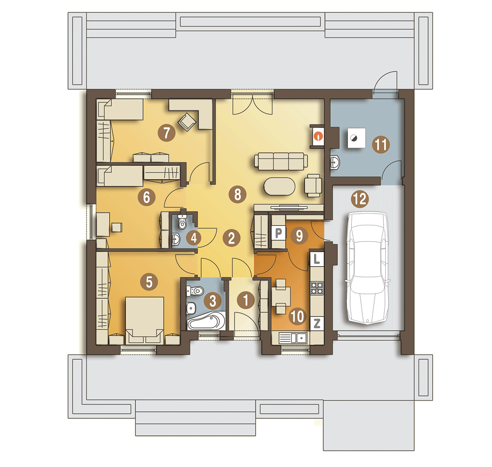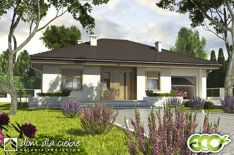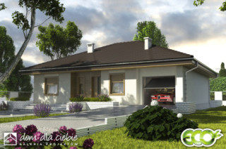Projekt gotowy Jer zawiera w swoim programie 3 sypialnie, salon, wc, łazienkę, hol centralny oraz kuchnię ze spiżarnią i wiatrołap. Część pomocniczą stanowi garaż i wygodna kotłownia na paliwo stałe. Ten prosty dom zaprojektowany na rzucie prostokąta przekryty został dachem wielospadowym z kalenicą. Ze względu na zwartą bryłę i niezbyt duża powierzchnię dom będzie tani w budowie i eksploatacji.fundamenty: BETONOWE ściany zewnętrzne: POROTHERM+STYROPIAN TERMO ORGANIKA rodzaj stropu: TERIVA I elewacje: TYNK STRUKTURALNY pokrycie dachu: DACHÓWKA CEM. lub CER.
