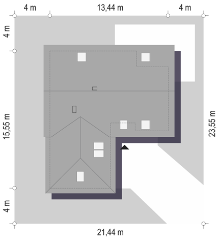 Dom przeznaczony dla 6-7 osobowej rodziny. Przez sień wchodzimy do holu. Z holu na prawo możemy przejść do kuchni, a na wprost do pokoju dziennego. Pokój dzienny z kuchnią łączy jadalnia. Na lewo od wejścia znajdują się pokój, łazienka oraz schody prowadzące w dół do pomieszczenia gospodarczego ( z kotłownią) i do góry na poddasze. Na poddaszu mieszczą się 3 pokoje, łazienka i przedpokój. Prostą bryłę zaprojektowaną na rzucie prostokąta przykrywa dach dwuspadowy o kącie nachylenia połaci 40°. Ściany jadalni wysunięte poza regularny obrys budynku. Dostawiony jednostanowiskowy garaż. Malownicze podcienie: wejściowy i wyjścia do ogrodu.
