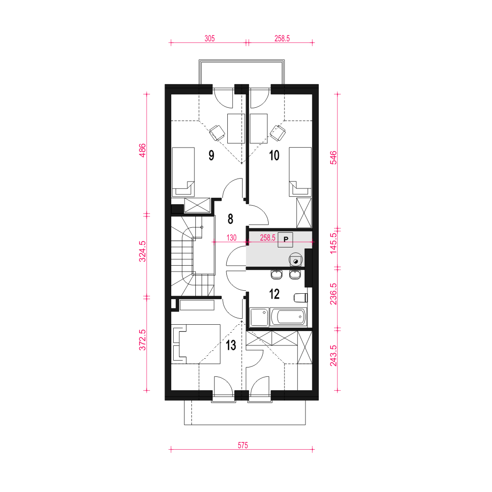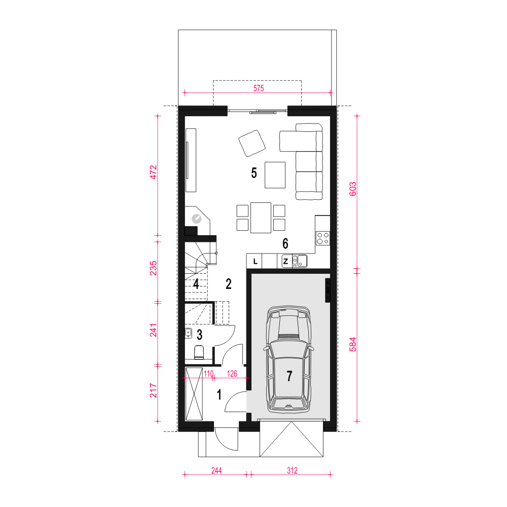 Jukka to atrakcyjny dom parterowy z poddaszem użytkowym w zabudowie szeregowej. To idealny projekt na wąskie działki o bardzo prostej i zwartej formie oraz o niedużej powierzchni użytkowej - blisko 100 m2 - co przekłada się na niski koszt budowy i eksploatacji domu. Projekt Jukka to dom dla 4-5cio osobowej rodziny z wbudowanym garażem, o tradycyjnej konstrukcji ścian z pustaków ceramicznych izolowanych styropianem. Dach dwuspadowy zaprojektowano jako podniesiony na ściankach kolankowych o wysokości 1,14 m. Funkcja domu obejmuje część ogólnodostępną na parterze i prywatną na poddaszu. Na parterze zaprojektowano część wejściową z wiatrołapem, holem, WC i schodami schodami prowadzącymi na poddasze. Dalej mamy przewidziany ustawny salon z kominkiem i jadalnią, oraz wygodny aneks kuchenny. Z salonu dostaniemy się na przydomowy ogród. Na poddasz zlokalizowana na poddaszu, obejmuje przedpokój z którego dostaniemy się do trzech sypialni, wspólnej łazienki oraz pomieszczenia pralni z piecem gazowym c.o. Jukka szeregówka, to projekt domu o parametrach energooszczędnych, o prostej konstrukcji i zwartej formie. To idealny projekt do realizacji inwestycji deweloperskich.fundamenty: BETONOWE ściany zewnętrzne: POROTHERM+STYROPIAN TERMO ORGANIKA rodzaj stropu: TERIVA I elewacje: TYNK STRUKTURALNY pokrycie dachu: DACHÓWKA CEM. lub CER.