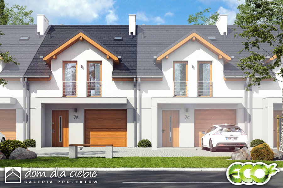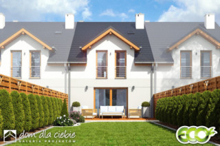 Projekt domu Jukka do atrakcyjny dom parterowy z poddaszem użytkowym w zabudowie szeregowej. To idealny projekt na wąskie działki o bardzo prostej i zwartej formie oraz o niedużej powierzchni użytkowej - blisko 100 m2 - co przekłada się na niski koszt budowy i eksploatacji domu. Projekt Jukka to dom dla 4-5cio osobowej rodziny z wbudowanym garażem, o tradycyjnej konstrukcji ścian z pustaków ceramicznych izolowanych styropianem. Dach dwuspadowy zaprojektowano jako podniesiony na ściankach kolankowych o wysokości 1,14 m. Funkcja domu obejmuje część ogólnodostępną na parterze i prywatną na poddaszu. Na parterze zaprojektowano część wejściową z wiatrołapem, holem, WC i schodami schodami prowadzącymi na poddasze. Dalej mamy przewidziany ustawny salon z kominkiem i jadalnią, oraz wygodny aneks kuchenny. Z salonu dostaniemy się na przydomowy ogród. Na poddasz zlokalizowana na poddaszu, obejmuje przedpokój z którego dostaniemy się do trzech sypialni, wspólnej łazienki oraz pomieszczenia pralni z piecem gazowym c.o. Jukka szeregówka, to projekt domu o parametrach energooszczędnych, o prostej konstrukcji i zwartej formie. To idealny projekt do realizacji inwestycji deweloperskich.