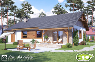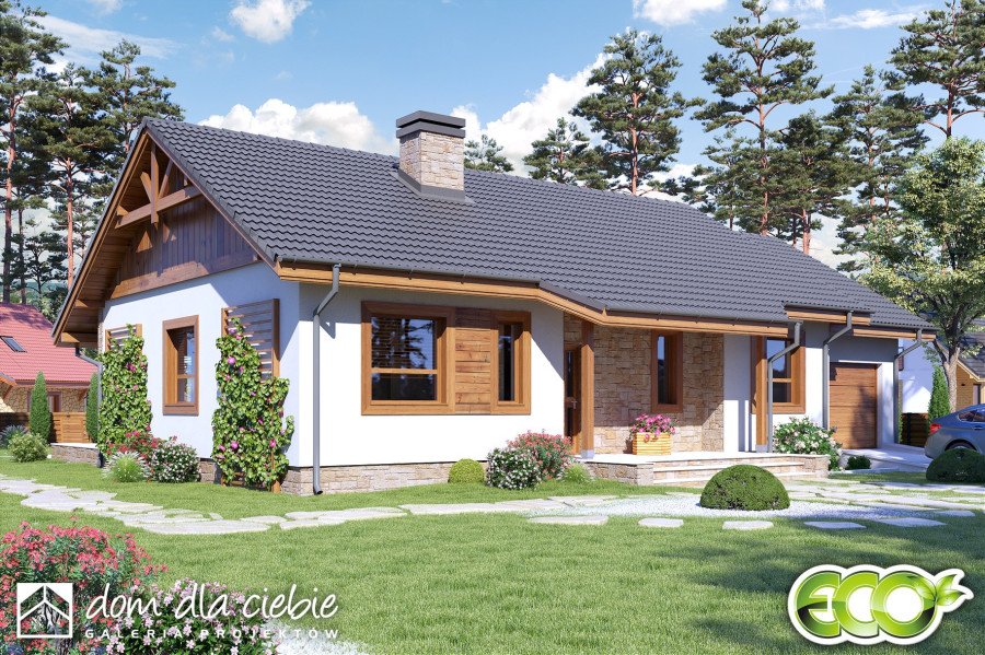 Julek to projekt funkcjonalny i tani w budowie ze względu na prostą konstrukcje dachu oraz nieskomplikowaną bryłę budynku. Zaprojektowany z myślą o 4-5 osobowej rodzinie. Zadbano o prosty podział strefy dziennej i nocnej. Strefa dzienna zawiera salon z otwartą kuchnią i spiżarnię, natomiast strefa nocna to trzy sypialnie, łazienka, wc oraz dodatkowy schowek z przejściem do garażu. Kotłownia została umieszczona z tyłu garażu w której wg projektu umieszczony jest piec gazowy, lecz wielkość kotłowni pozwala na zastosowanie kotła na paliwo stałe. JUŻ DOSTĘPNY PROJEKT JULEK Z PIECEM NA PALIWO STAŁE.fundamenty: BETONOWE ściany zewnętrzne: POROTHERM+STYROPIAN TERMO ORGANIKA ściany wewnętrzne: POROTHERM, GK rodzaj stropu: TERIVA I elewacje: TYNK STRUKTURALNY pokrycie dachu: DACHÓWKA CERAMICZNA
