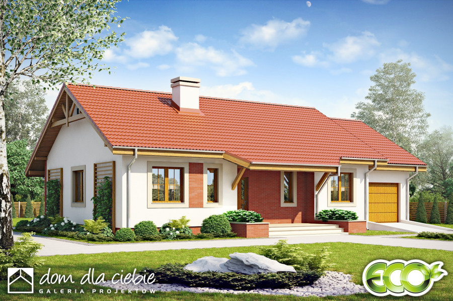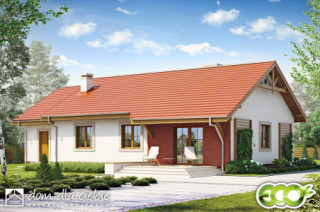 Julek styl to funkcjonalny i tani w budowie mały dom parterowy. Prostokątna bryła budynku i nieskomplikowany dwuspadowy dach, decydują o jego niskich kosztach budowy. Julek styl zaprojektowany jest z myślą o 4-5 osobowej rodzinie. Wejście do budynku jak i wyjście na taras zadaszone są wysuniętymi fragmentami dachu. W projekcie zadbano o funkcjonalny podział na strefy dzienną i nocną. Strefa dzienna obejmuje salon z otwartą kuchnią i spiżarnię, natomiast strefa nocna obejmuje trzy sypialnie, łazienkę, pomieszczenie wc oraz schowek z przejściem do garażu. Kotłownia została zaprojektowana za garażem i przewidziano tu piec na paliwo stałe. Ten atrakcyjny wizualnie projekt małego domu to idealna propozycja dla osób szukających nieskomplikowanej bryły z czytelnym rozkładem pomieszczeń. Dzięki dobrze zaprojektowanej funkcji projekt w większości wypadków nie będzie wymagał wprowadzania zmian na etapie adaptacji.fundamenty: BETONOWE ściany zewnętrzne: POROTHERM+STYROPIAN TERMO ORGANIKA ściany wewnętrzne: POROTHERM, GK rodzaj stropu: TERIVA I elewacje: TYNK STRUKTURALNY pokrycie dachu: DACHÓWKA CERAMICZNA