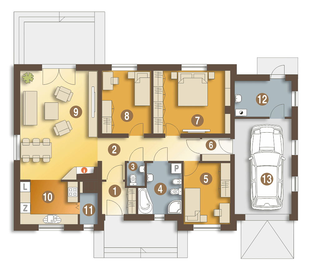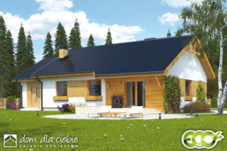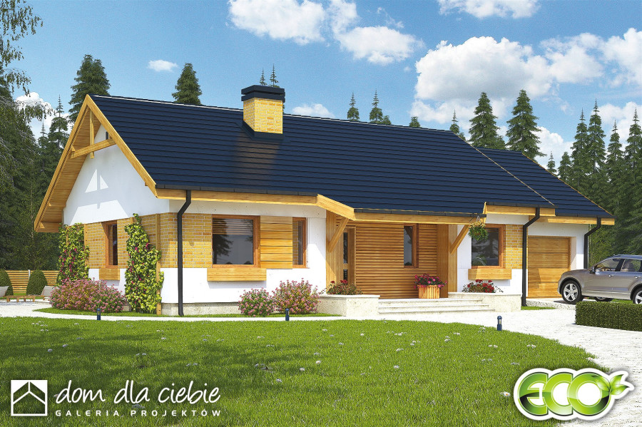 Julek trend to funkcjonalny i tani w budowie mały dom parterowy. Prostokątny obrys budynku i nieskomplikowany dwuspadowy dach, decydują o jego ekonomicznych zaletach. Zaprojektowany z myślą o 4-5 osobowej rodzinie. Wejście do budynku jak i wyjście na taras zadaszone jest wysuniętymi fragmentami dachu głównego. Zadbano o prosty podział strefy dziennej i nocnej. Strefa dzienna zawiera salon z otwartą kuchnią i spiżarnię, natomiast strefa nocna to trzy sypialnie, łazienka, wc oraz dodatkowy schowek z przejściem do garażu. Kotłownia została zaprojektowana z tyłu garażu w której umieszczony jest piec na paliwo stałe. Ten projekt małego domu to idealna propozycja dla osób szukających nieskomplikowanej bryły z czytelnym układem pomieszczeń.fundamenty: BETONOWE ściany zewnętrzne: POROTHERM+STYROPIAN TERMO ORGANIKA ściany wewnętrzne: POROTHERM, GK rodzaj stropu: TERIVA I elewacje: TYNK STRUKTURALNY pokrycie dachu: DACHÓWKA CERAMICZNA