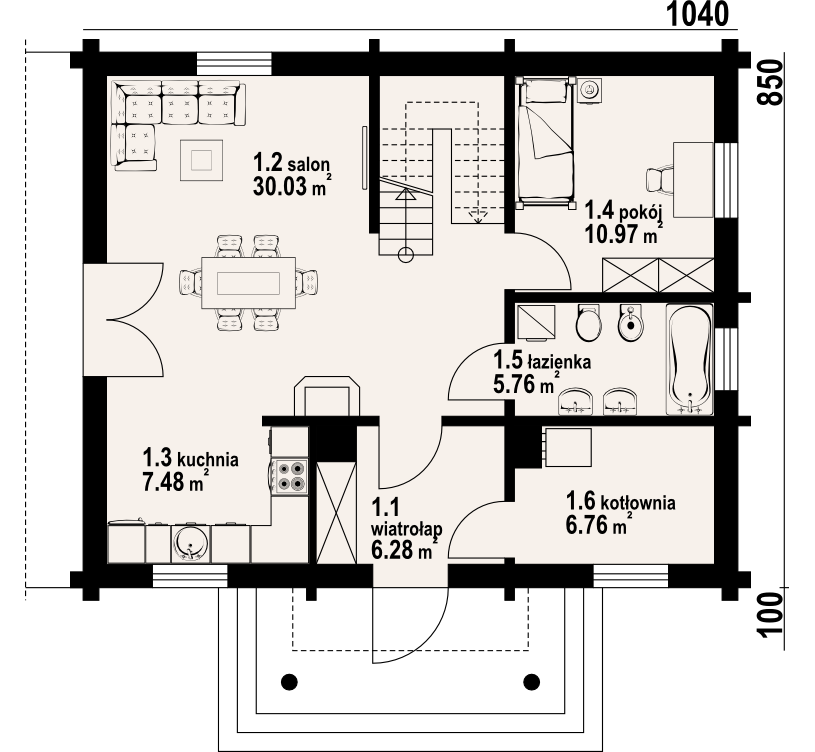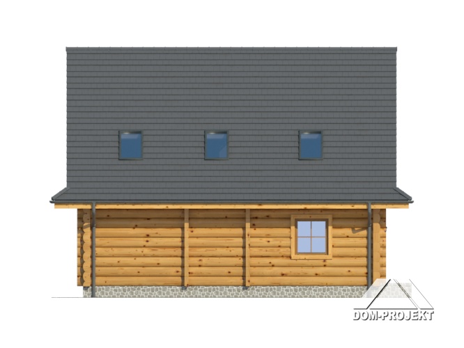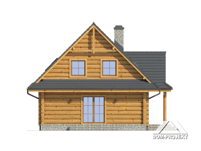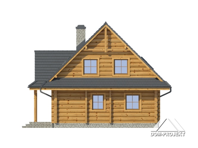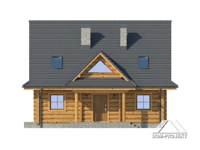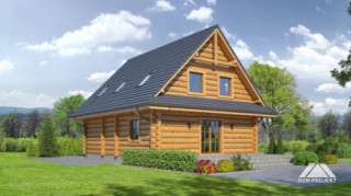 Dom z bali drewnianych. Duży salon z aneksem kuchennym, kominkiem i wyjściem na taras. Pokój, łazienka, komunikacja, wiatrołap, kotłownia. Na poddaszu cztery pokoje, łazienka i komunikacja. Zwarta bryła budynku i dach dwuspadowy sprzyjają szybkiej i taniej budowie i niskim kosztom eksploatacji.