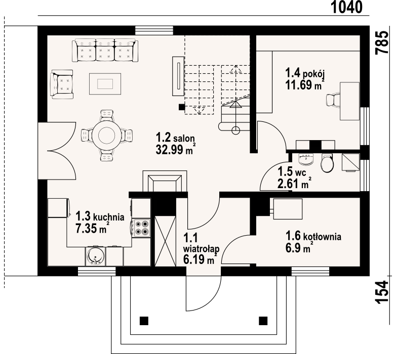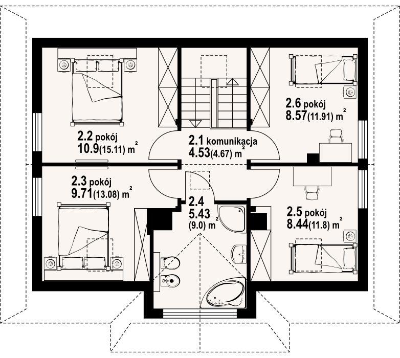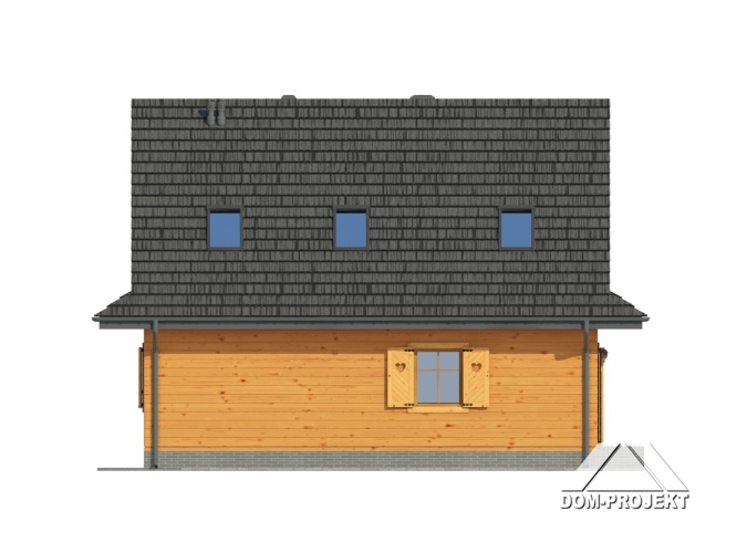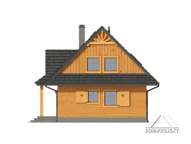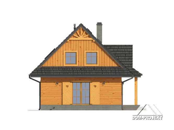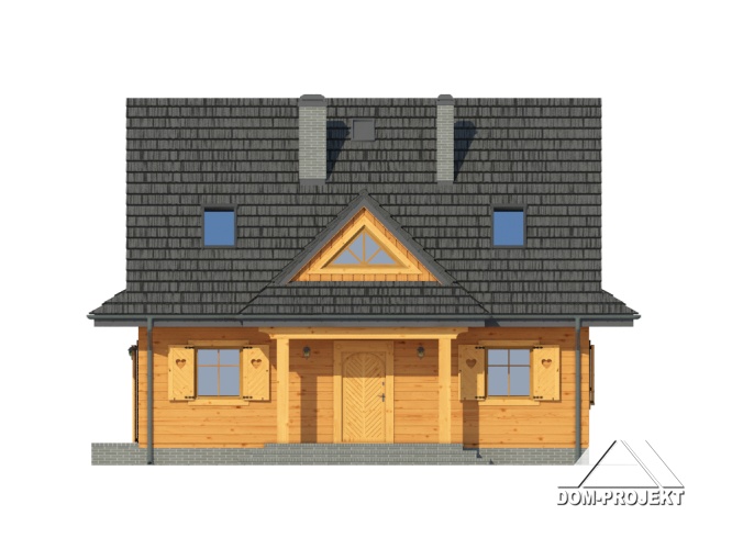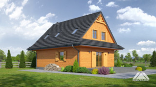 Dom w konstrukcji szkieletu drewnianego. Duży salon z kominkiem, aneksem kuchennym, schodami na poddasze i wyjściem na taras. Pokój, wc z pralką, kotłownia, wiatrołap. Na poddaszu cztery pokoje, łazienka i komunikacja. Zwarta bryła budynku i dach dwuspadowy sprzyjają szybkiej i taniej budowie i niskim kosztom eksploatacji.