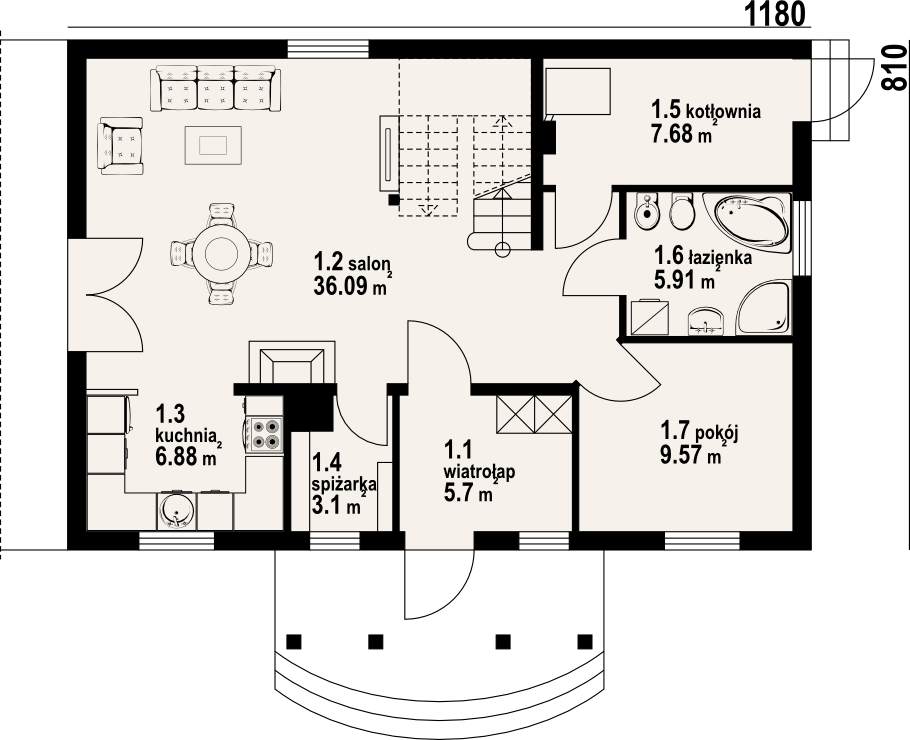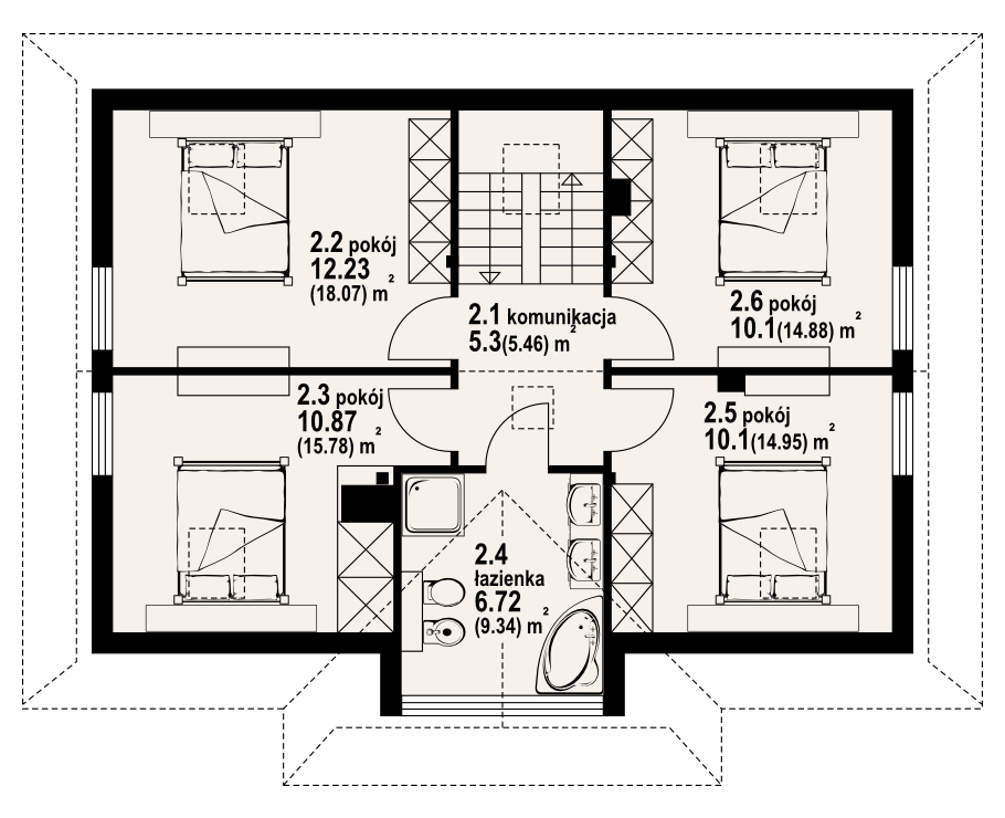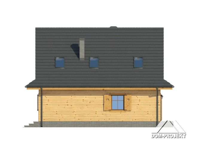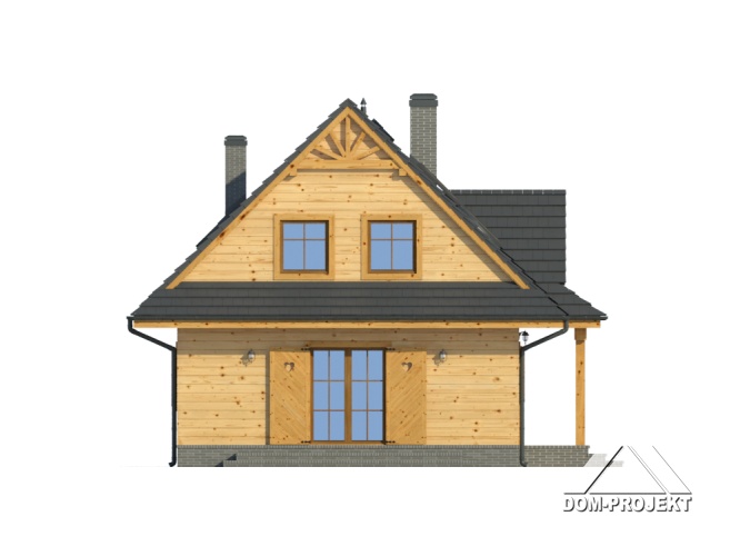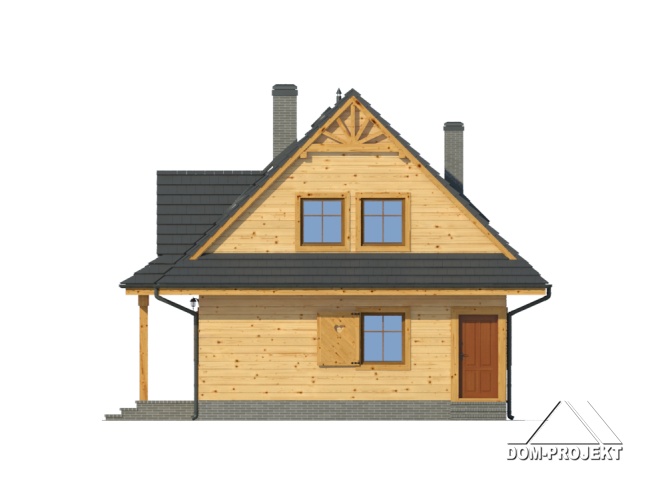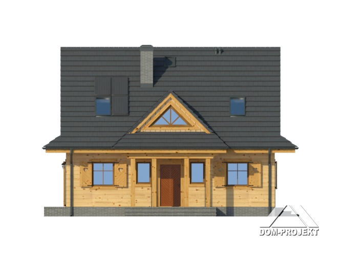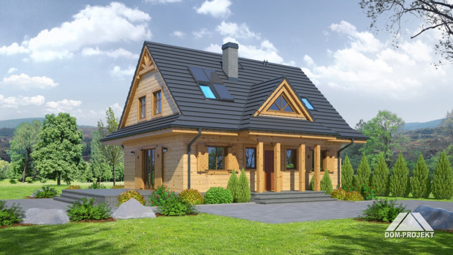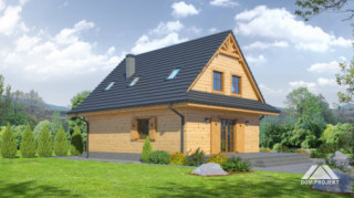 Dom w konstrukcji szkieletu drewnianego. Duży salon z aneksem kuchennym, kominkiem, wyjściem na taras i schodami na poddasze. Pokój, łazienka, kotłownia, wiatrołap. spiżarka. Na poddaszu cztery pokoje, łazienka, komunikacja. Zwarta bryła budynku sprzyja szybkiej i taniej budowie oraz niskim kosztom eksploatacji.