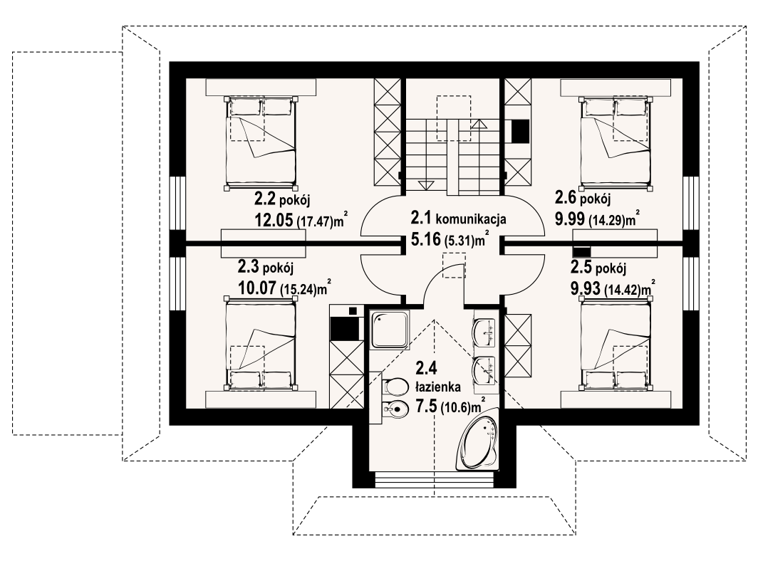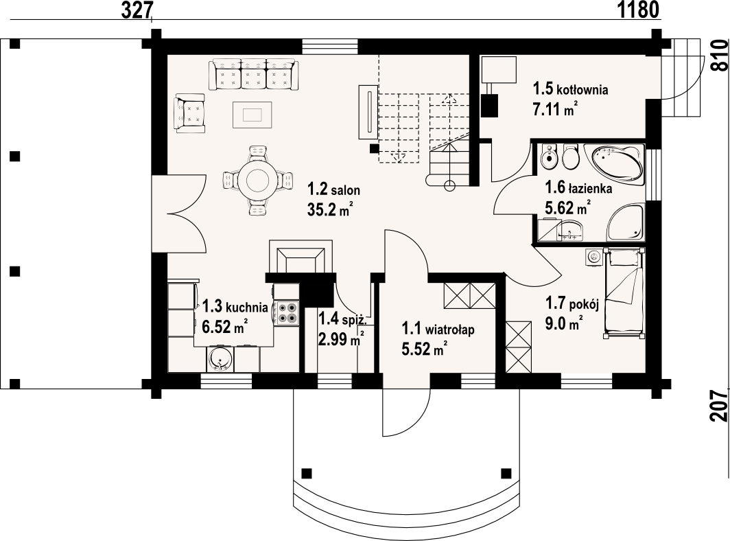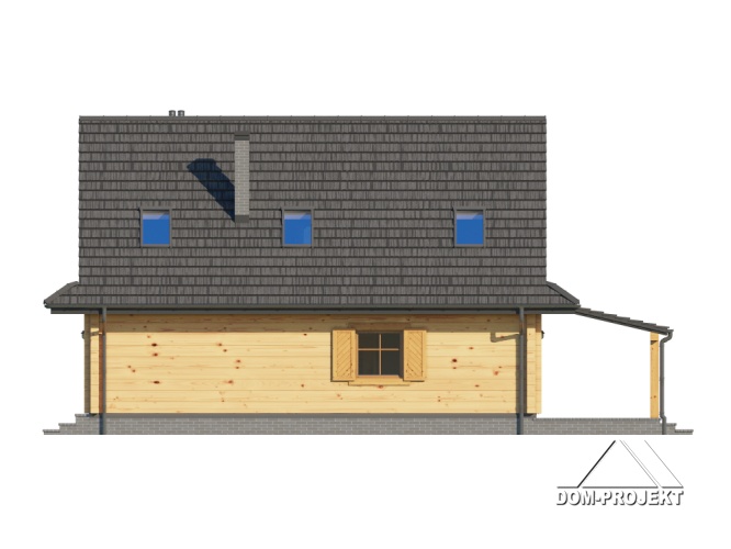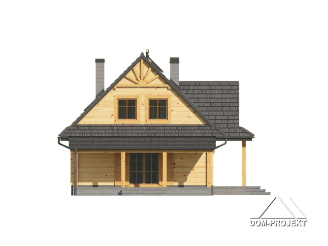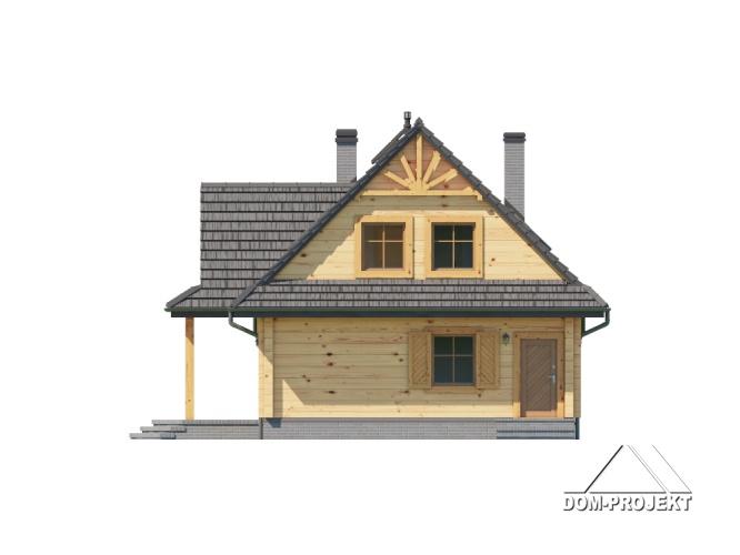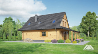 Dom drewniany z bali. Duży salon z aneksem kuchennym, kominkiem, schodami na poddasze i wyjściem na zadaszony taras. Pokój, łazienka, wiatrołap, spiżarka i kotłownia. Na poddaszu cztery pokoje, łazienka i komunikacja. Zwarta bryła budynku i dach dwuspadowy sprzyjają szybkiej i taniej budowie i niskim kosztom eksploatacji.
