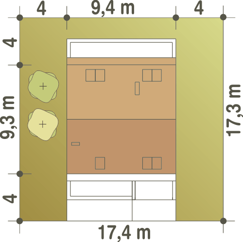 Na parterze zlokalizowano: sień wejściową, hol, pokój dzienny, kuchnię, łazienkę oraz garaż dostępny z zewnątrz. Na poddaszu znajdują się trzy sypialnie oraz łazienka. Głębokie parcele na terenach pod zabudowę bliźniaczą dobrze wykorzystują projekty domów z garażem dostawionym od frontu np. Juta Duo i Enzo Duo. Oba proponują łączenie lustrzanych segmentów ścianami garażu, co zapewnia większą prywatność wejściom do obu mieszkań. Projekt domu Juta Duo jest dużo mniejszy i wymaga działki węższej o ponad dwa metry. Oprócz najskromniejszej powierzchni i bardzo oszczędnych rozwiązań, wśród domów do zabudowy w granicy działki wyróżnia się dostosowaniem układu pomieszczeń do lekkiego pochylenia terenu w kierunku wjazdu na parcelę. Bryła składa się z części mieszkalnej z dwuspadowym dachem i z płasko przekrytego garażu, dostępnego z wejściowego podcienia. Parter ma nieco obniżoną strefę wejścia z łazienką oraz, od strony ogrodu, położony wyżej otwarty pokój dzienny ze schodami na poddasze. Tu mieszczą się trzy sypialnie i łazienka dostosowane poziomami podłogi do układu parteru. Narożne okno w salonie i kolankowe okna umożliwiające korzystanie z tarasu nad garażem z najmniejszej sypialni nadają prostej sylwetce Juty Duo nowoczesny charakter.