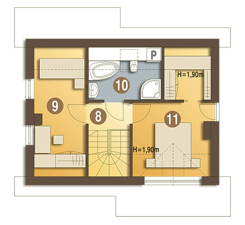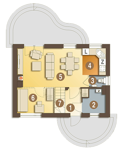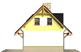 Mały, urokliwy domek dla 3-4 osobowej rodziny. Może z powodzeniem pełnić rolę domu całorocznego jak i letniskowego. Na niewielkiej powierzchni mieści, w bardzo funkcjonalnym układzie, wszystkie potrzebne pomieszczenia. Wiatrołąp posiada miejsce na szafę wnękową oraz możliwość wykorzystania miejsca pod niższym biegiem schodów np. na szuflady. Pom. gospodarcze pomieści piec gazowy oraz niezbędne w każdym domu sprzęty i urządzenia. Strefę ogólnodostępną parteru zaprojektowano w taki sposób, aby uzyskać jak najwiekszą przestrzeń, z tego powodu zaproponowano otwartą kuchnię i jednoprzestrzenny salon z jadalnią, a także zadbano o to, aby dostępny z salonu dodatkowy pokój, był wydzielony jedynie za pomocą ścianki działowej, prostej do likwidacji. Na poddaszu zaprojektowano dwie sypialnie: jedną niewielką ale ustawną, drugą większą z wewnętrzną garderobą oraz dość dużą łazienkę. W wersji z garażem poddasze powiększono o jeszcze jedną sypialnię.fundamenty: BETONOWE ściany zewnętrzne: POROTHERM+STYROPIAN TERMO ORGANIKA rodzaj stropu: TERIVA I elewacje: TYNK STRUKTURALNY pokrycie dachu: DACHÓWKA CEM. lub CER.