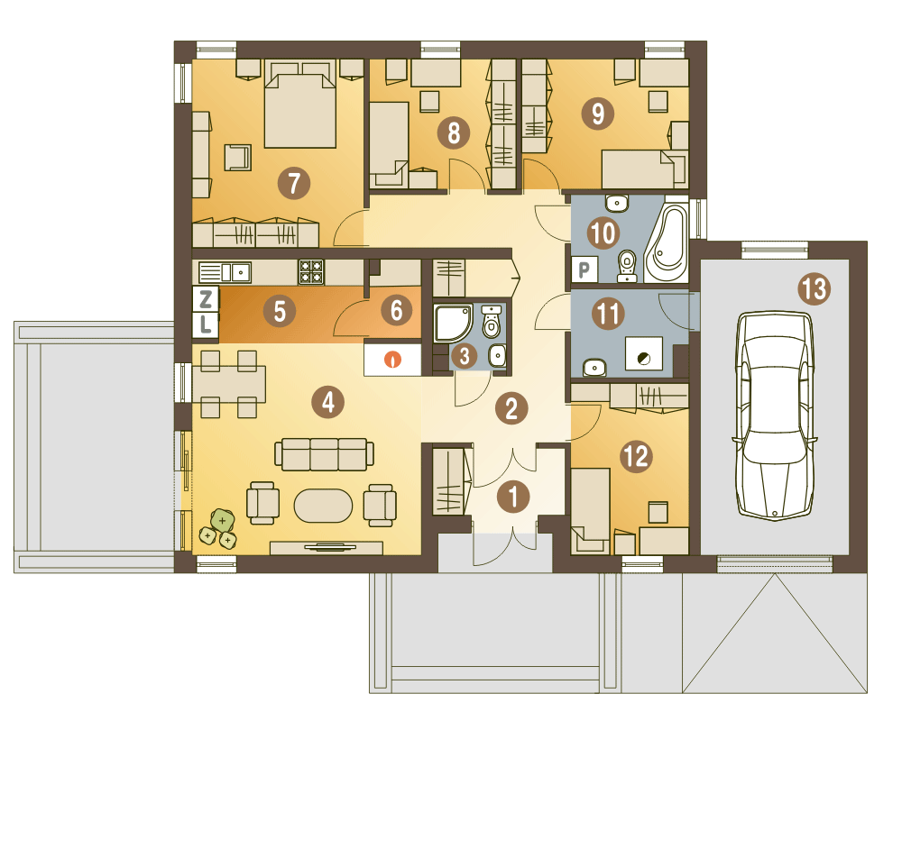 Projekt Kalandra II przeznaczony jest dla 4-5 osobowej rodziny. Jest to dom parterowy aż z pięcioma pokojami (wliczając salon). Projekt zawiera: wiatrołap, kotłownię na paliwo stałe, hol, 4 sypialnie salon z kuchnią i spiżarnią oraz dwie łazienki. Elewacje zewnętrzne Kalandry II są nowoczesne i eleganckiefundamenty: BETONOWE ściany zewnętrzne: POROTHERM+STYROPIAN TERMO ORGANIKA rodzaj stropu: TERIVA I elewacje: TYNK STRUKTURALNY pokrycie dachu: DACHÓWKA CEM. lub CER.