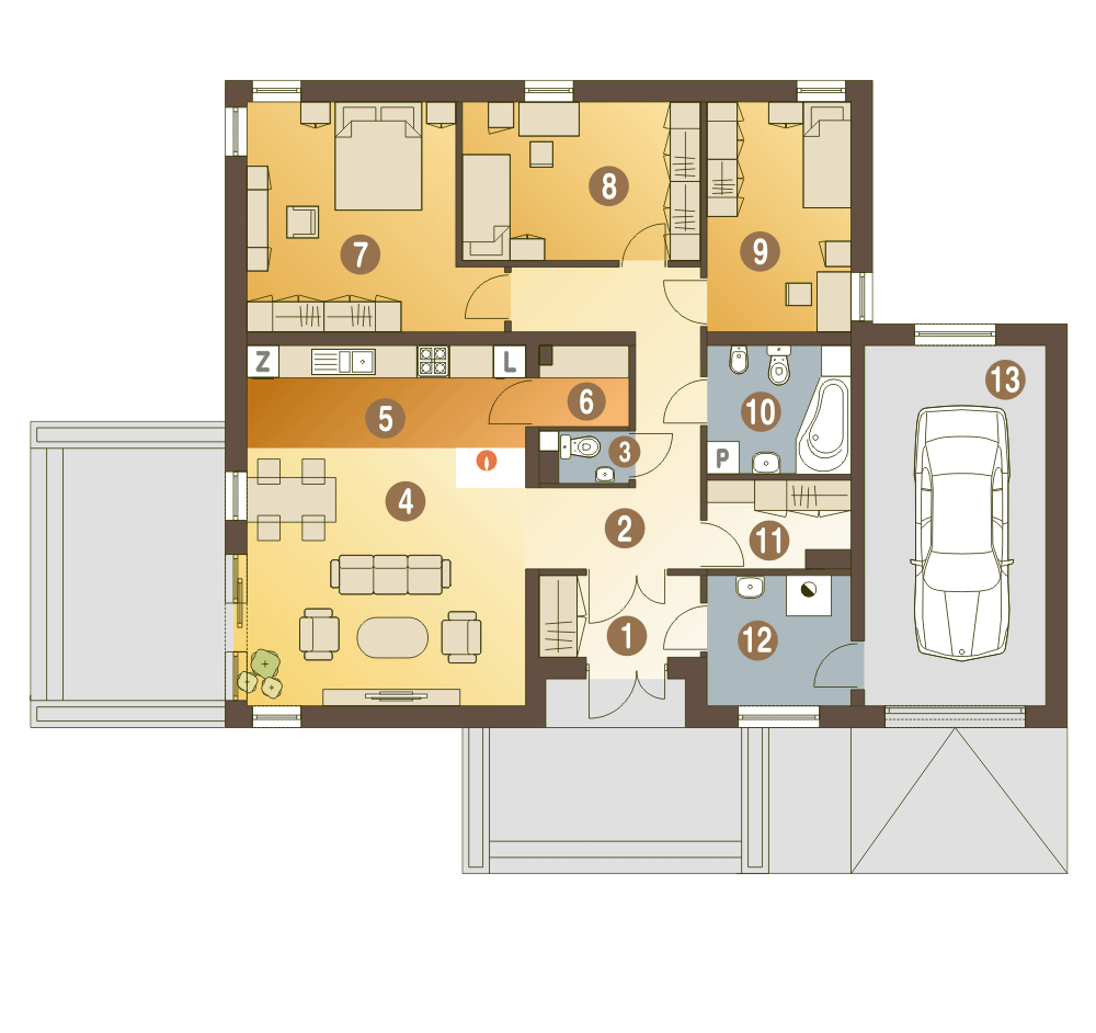 Projekt Kalandra III przeznaczony jest dla 4-5 osobowej rodziny. Jest to dom parterowy z czterema pokojami (wliczając salon). Projekt zawiera: wiatrołap, kotłownię na paliwo stałe, hol, 3 sypialnie, salon z kuchnią i spiżarnią oraz łazienkę, WC i garderobę. Elewacje zewnętrzne Kalandry III są nowoczesne i eleganckie.fundamenty: BETONOWE ściany zewnętrzne: POROTHERM+STYROPIAN TERMO ORGANIKA rodzaj stropu: TERIVA I elewacje: TYNK STRUKTURALNY pokrycie dachu: DACHÓWKA CEM. lub CER.