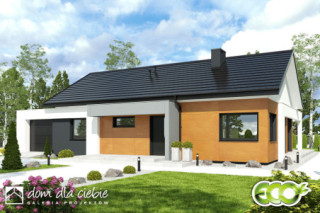 Projekt domu Kalikst z przybudowanym garażem to nowoczesny dom dla 4-5cio osobowej rodziny. Dom zaprojektowano w technologii murowanej z prefabrykowaną więźbą dachową. Kalikst to funkcjonalny projekt domu łączący strefę ogólnodostępną i prywatną na jednej kondygnacji. W części wejściowej mamy przewidziany wiatrołap z wnękową szafą, pralnię oraz wydzieloną toaletę. W części ogólnodostępnej mamy obszerny salon z miejscem na wygodny, sześcioosobowy stół jadalniany. Dzięki dużym przesuwnym drzwiom tarasowym, dostaniemy się z salonu na zewnątrz, na taras z pergolą. Charakterystycznym elementem salonu, jest duży nowoczesny kominek, usytuowany przy kuchni. Kuchnia z meblami usytuowanymi w kształcie litery "u" i z dodatkową przestrzenią na osobną spiżarnię, zapewnia komfortową przestrzeń do pracy. Narożne okna kuchenne gwarantują odpowiednią ilość światła zewnętrznego. Część prywatna dostępna jest z niedużego korytarza, który doświetlony jest dwoma świetlikami rurowymi umiejscowionymi w suficie. W tej strefie mamy zaprojektowane trzy pokoje sypialne, wspólną wygodną łazienkę z wanna i prysznicem oraz przechodnią garderobę. Z garderoby dostaniemy się do przybudowanego garażu, za którym mamy zaprojektowaną kotłownią na paliwo stałe. Kalikst to atrakcyjna propozycja domu energooszczędnego, o nowoczesnej architekturze i charakterystycznej elewacji, w nowoczesnych odcieniach szarości i czerni, skontrastowanych ciepłym kolorem okładziny drewnopodobnej. Kalikst w wariancie z garażem, to projekt domu z serii "eco" - ekonomiczny w budowie i w utrzymaniu.fundamenty: BETONOWE ściany zewnętrzne: POROTHERM+STYROPIAN TERMO ORGANIKA ściany wewnętrzne: POROTHERM rodzaj stropu: prefabrykowane wiązary dachowe Mitek elewacje: TYNK STRUKTURALNY/ OKŁADZINA DREWNIANA/DREWNOPODOBNA pokrycie dachu: DACHÓWKA CERAMICZNA